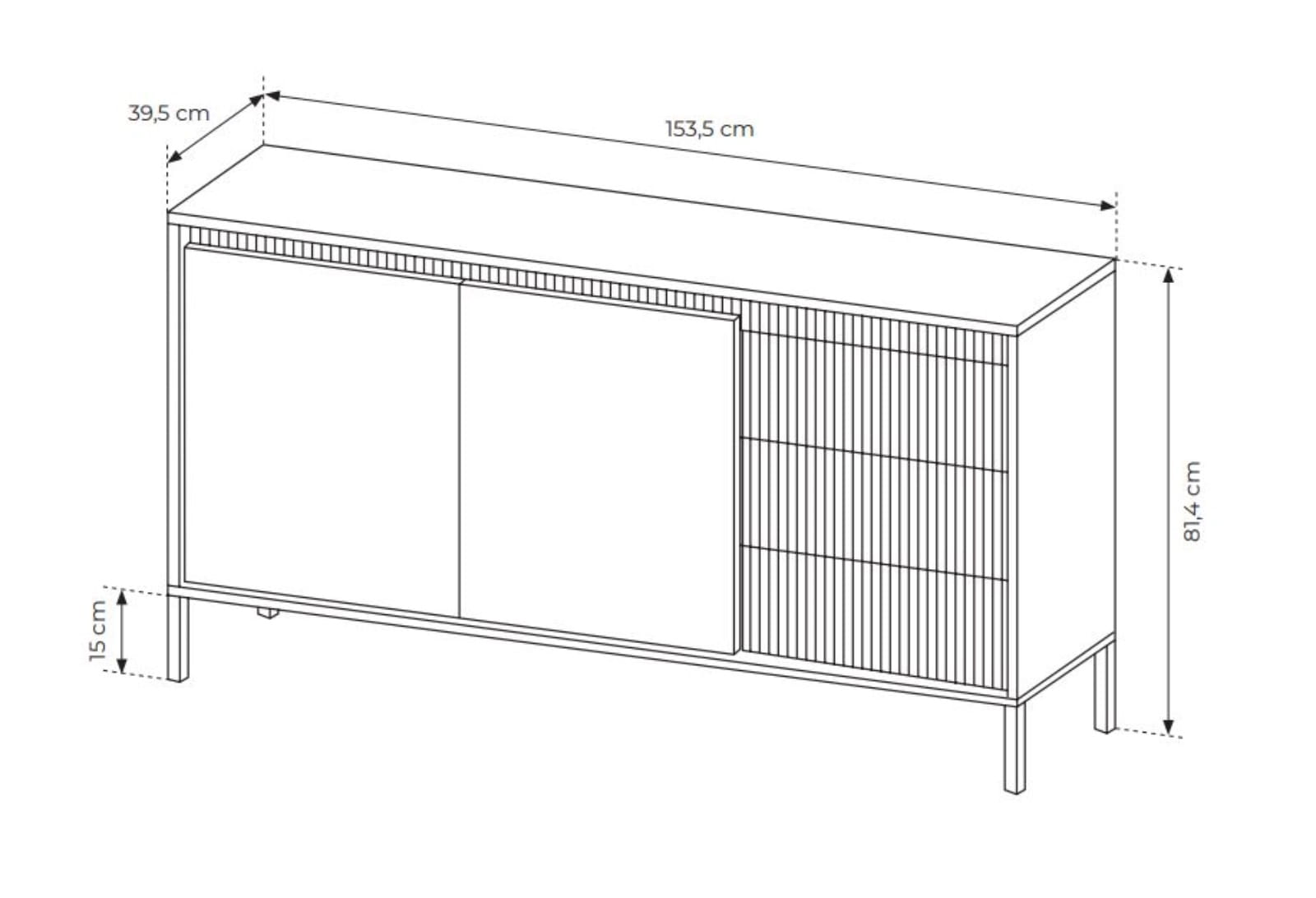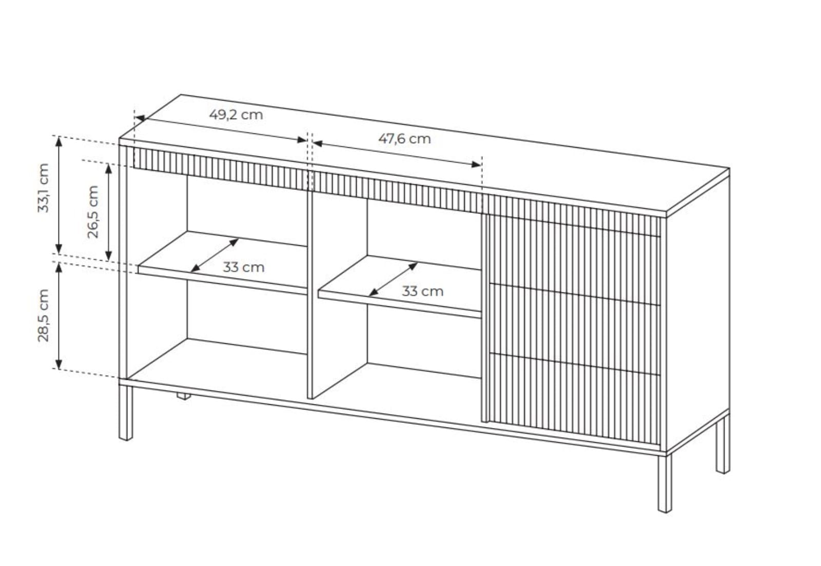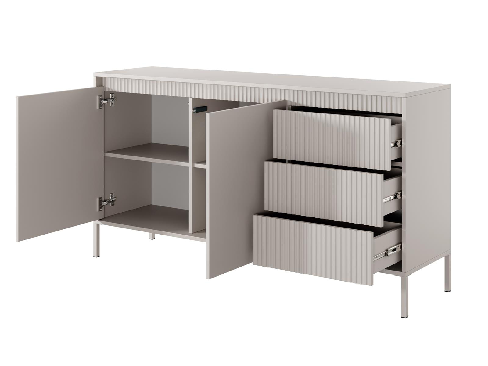Charakterystycznym elementem komody są dekoracyjne, ryflowane fronty, które nadają jej wyjątkowego stylu i elegancji. Delikatna, pionowa struktura przełamuje prostotę formy, dodając meblowi głębi i wyrafinowanego charakteru. To detal, który przyciąga uwagę, a jednocześnie pozostaje spójny z minimalistycznym designem.