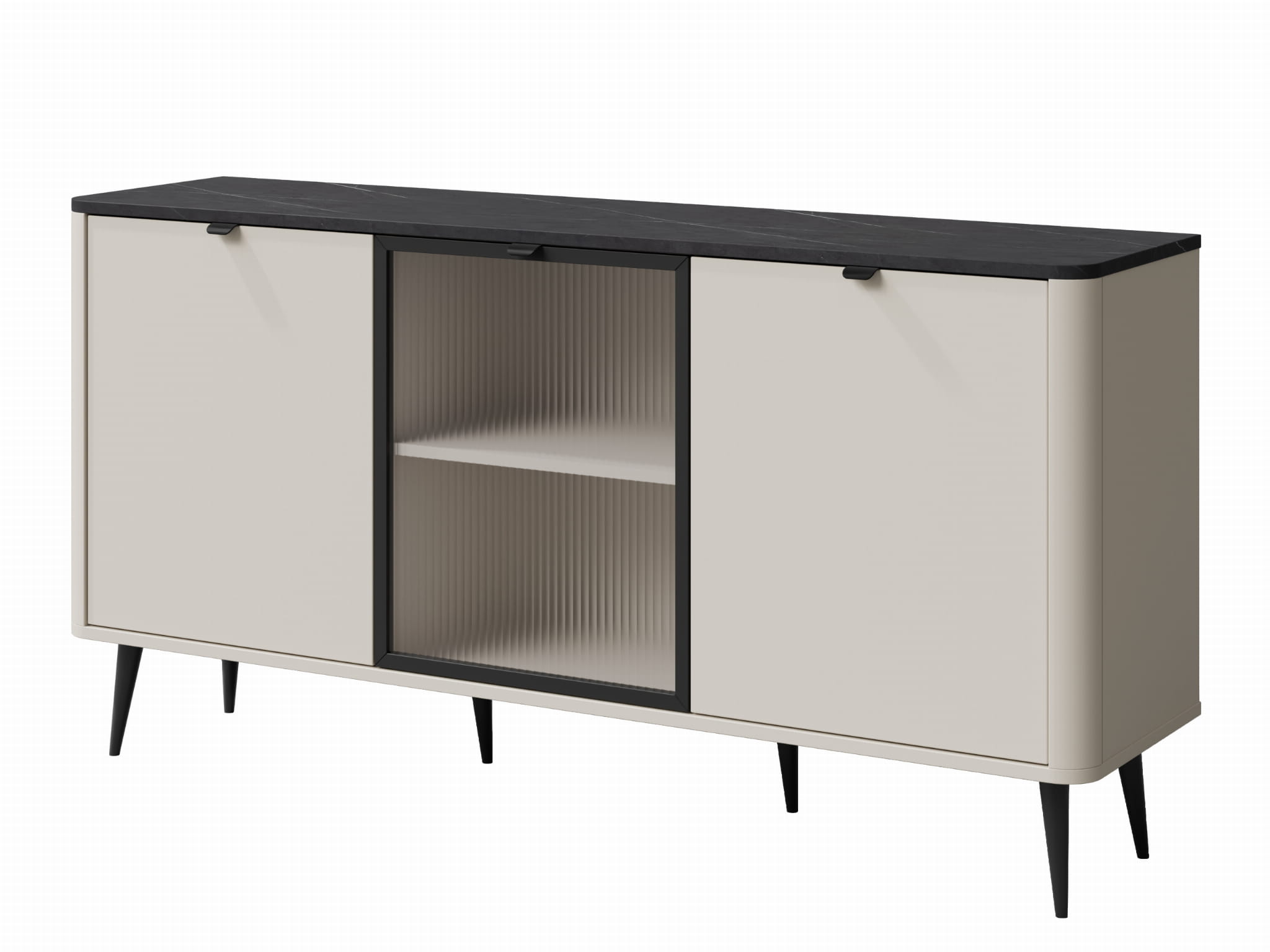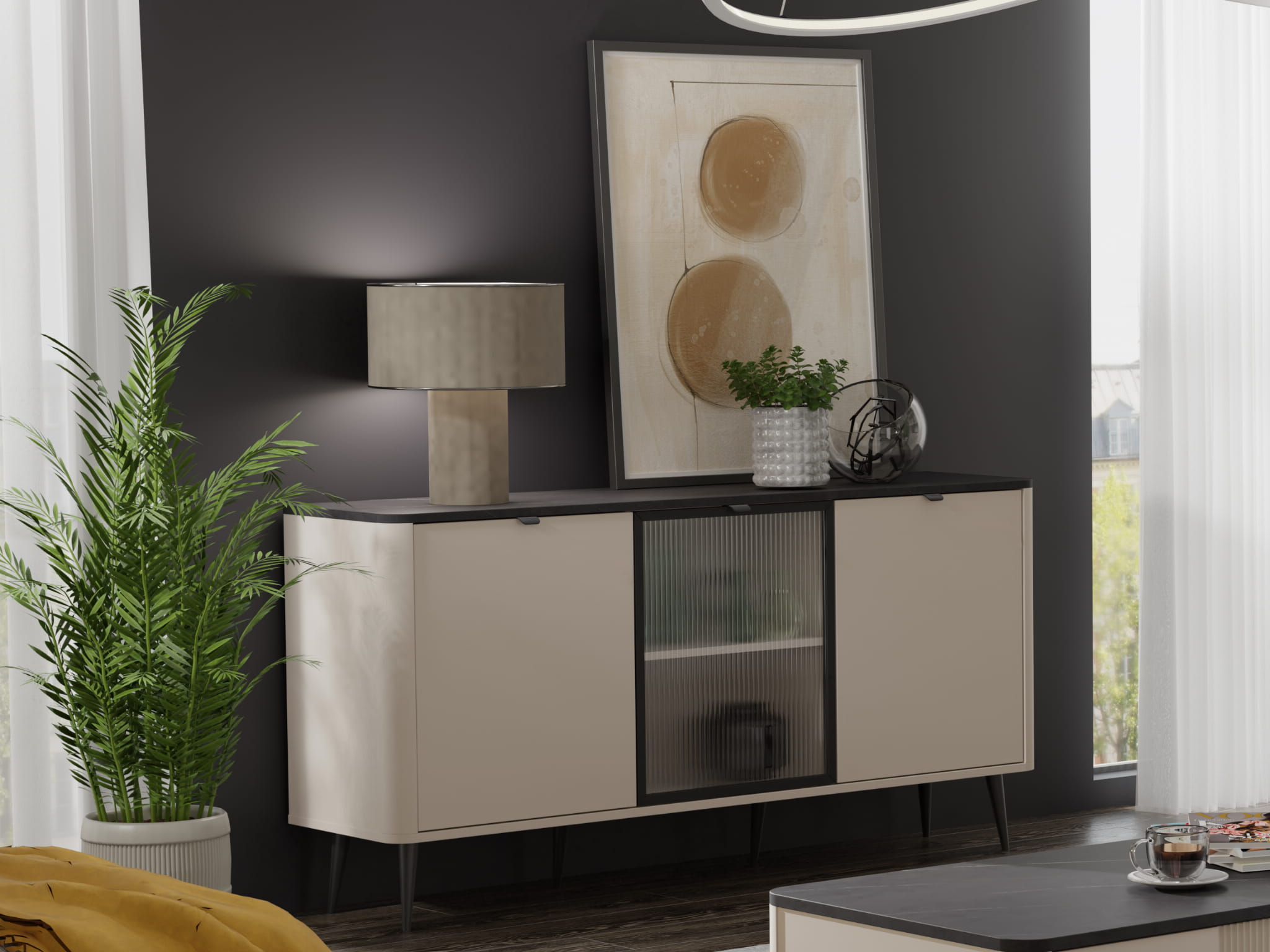 Wysokie, czarne nóżki oraz czarne, cienkie uchwyty dodają meblowi lekkości i industrialnego charakteru. Przeszklona część witryny umożliwia stylową ekspozycję dekoracji, szkła lub książek, podczas gdy dolne zamknięte półki pozwalają utrzymać porządek i ukryć codzienne drobiazgi. Ten model to doskonała propozycja do wnętrz w stylu loftowym, minimalistycznym, nowoczesnym i soft industrial. Sprawdzi się zarówno w przestronnym salonie, nowoczesnej jadalni, jak i jako designerski akcent w biurze.