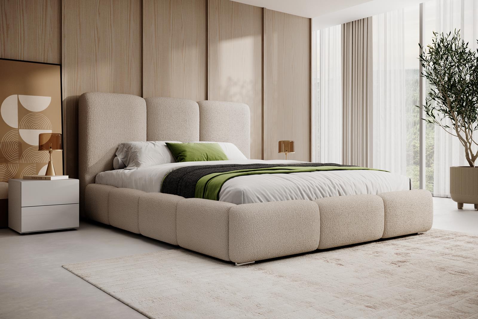 Łóżko boucle tapicerowane z pojemnikiem MERIDA
