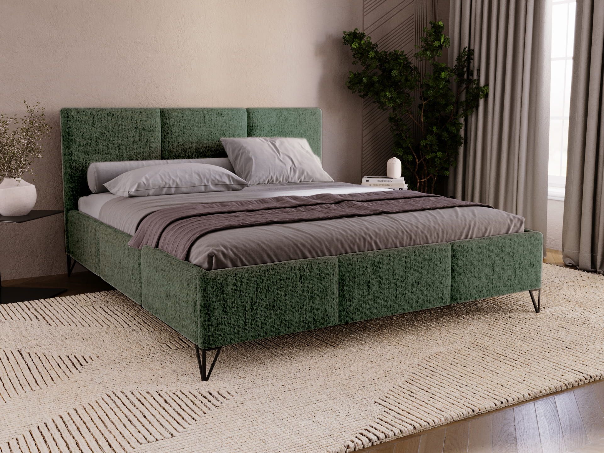 Wprowadź do swojej sypialni głębię koloru i ponadczasowy styl z ciemnozielonym łóżkiem NEVS. Tapicerka w odcieniu butelkowej zieleni doskonale oddaje elegancję i spokój natury, tworząc idealną atmosferę do wypoczynku. Retro forma z wysokim, pionowo przeszywanym zagłówkiem przyciąga spojrzenia i daje oparcie podczas czytania lub pracy w łóżku.