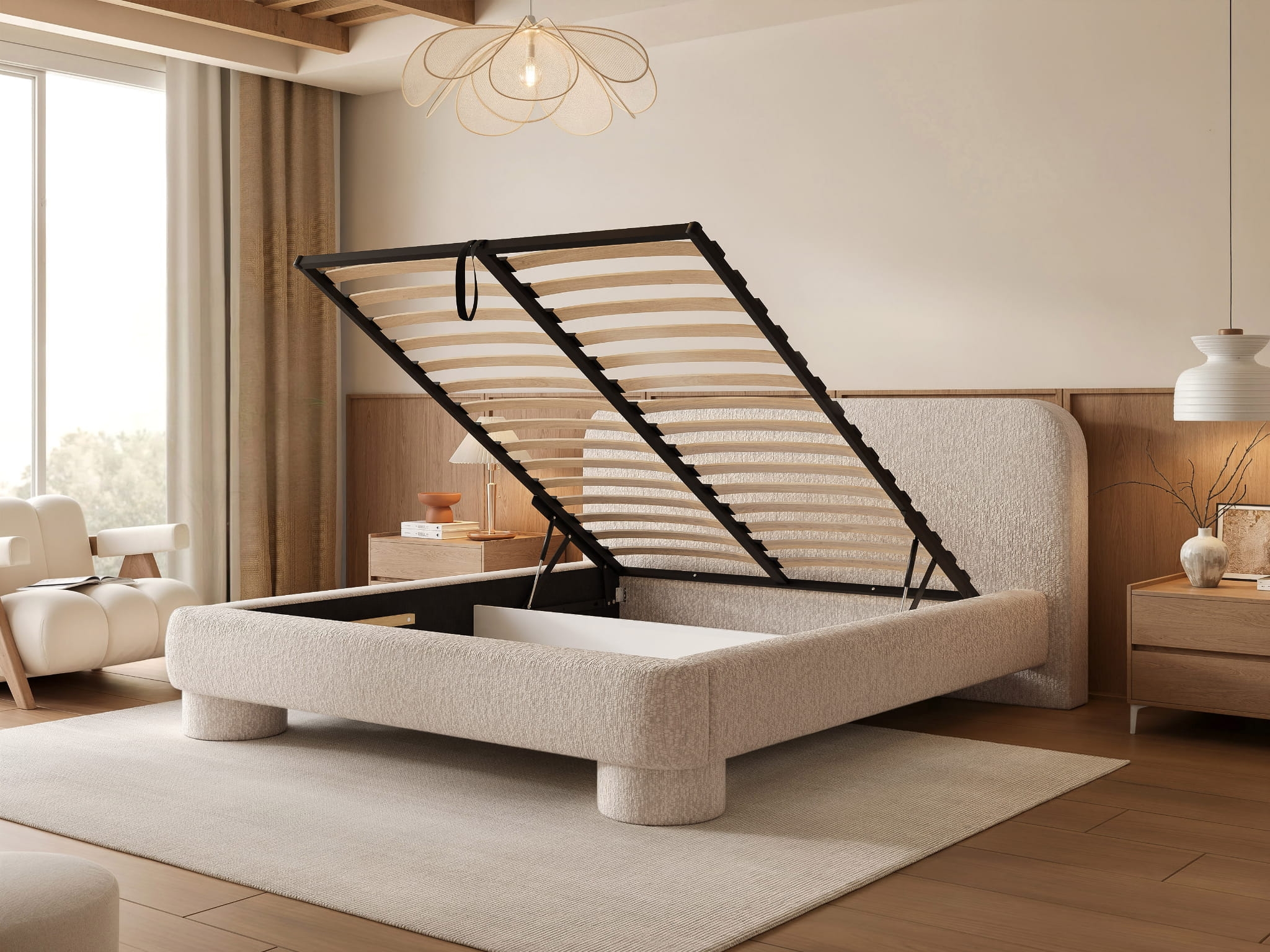 Miedziane zaokrąglone łóżko do eleganckiej sypialni JAPANDI