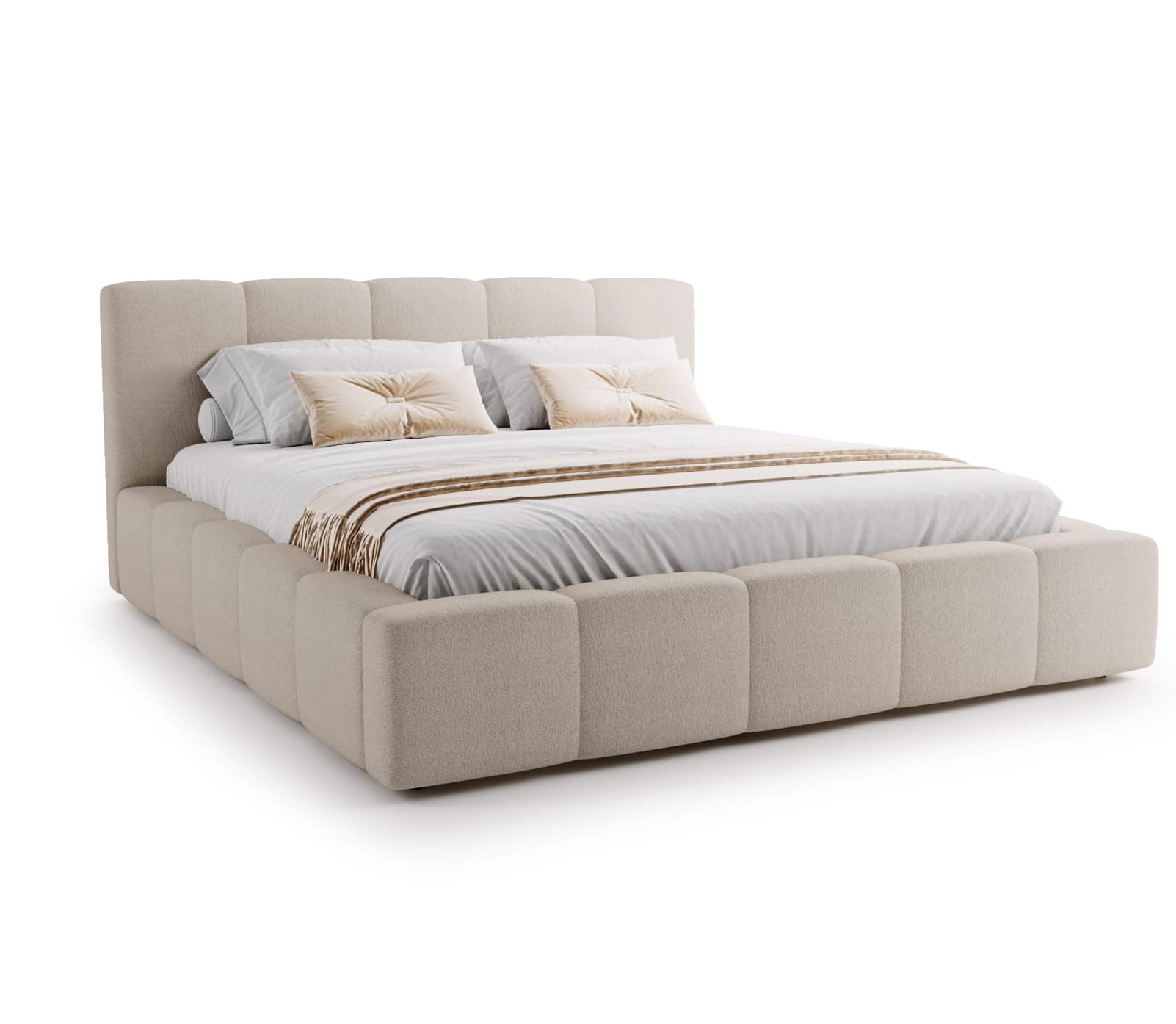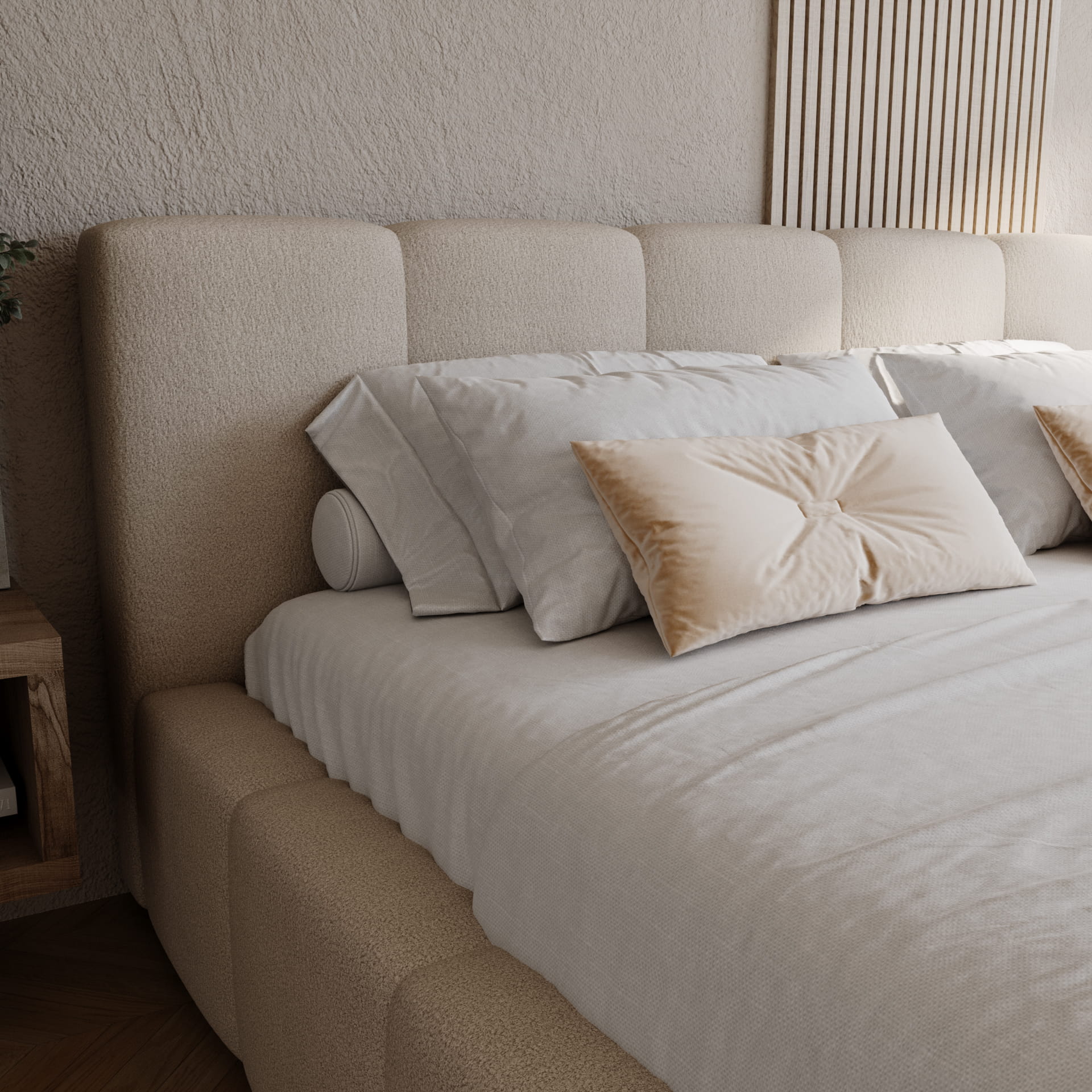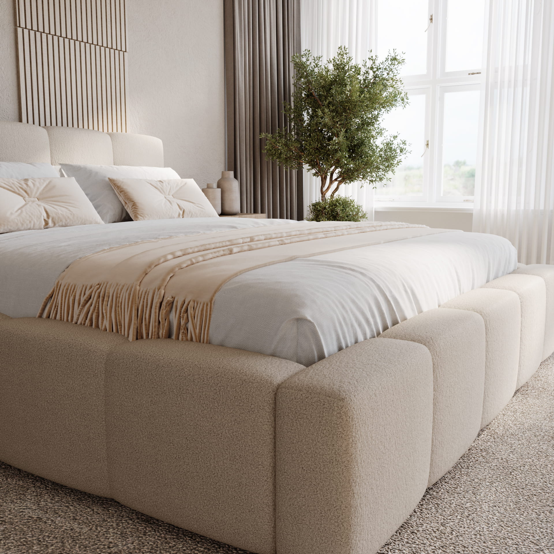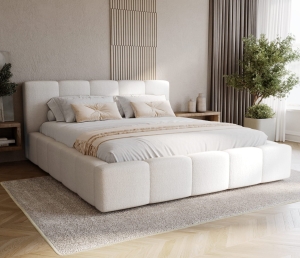 Wykonane z najwyższej jakości tkaniny bouclé w eleganckim, śnieżnobiałym odcieniu, łóżko tapicerowane NOVS zachwyca miękką strukturą, która dodaje przytulności i klasy. Obłe, organiczne kształty zagłówka i ramy nawiązują do ekskluzywnego trendu mebli w stylu „bubble bed”.