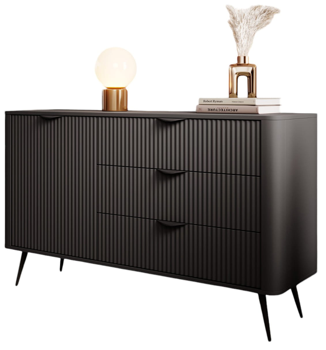 Marzysz o meblu, który połączy w sobie nowoczesną estetykę, elegancję i przemyślaną funkcjonalność? Komoda Bello w głębokim, czarnym wykończeniu to propozycja stworzona z myślą o najbardziej wymagających wnętrzach. Jej czarna konstrukcja idealnie wpisuje się w aktualne trendy aranżacyjne, dodając przestrzeni wyrafinowania i nowoczesnego stylu. Główną ozdobą frontu jest subtelne ryflowanie, które nie tylko podkreśla oryginalny charakter mebla, ale także wprowadza grę światła i cienia, dając efekt trójwymiarowości.