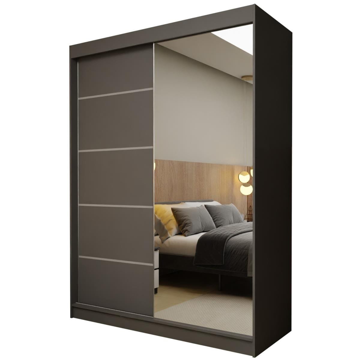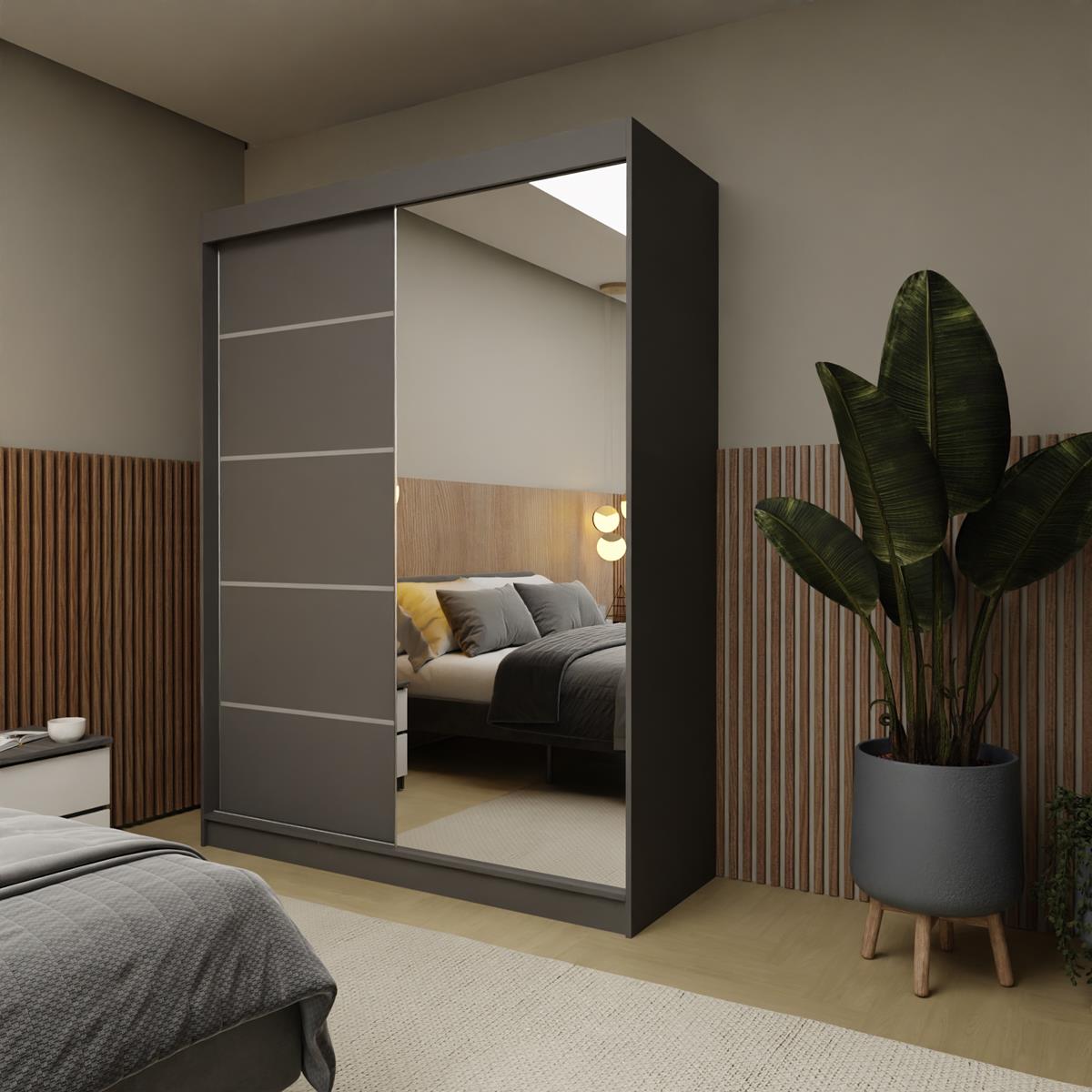 Nowoczesna grafitowa szafa przesuwna z lustrem to idealne rozwiązanie dla osób ceniących elegancję, funkcjonalność i oszczędność miejsca. Prezentuje minimalistyczny design w odcieniu grafitu, który doskonale komponuje się z każdym stylem wnętrza - od nowoczesnego po klasyczny.