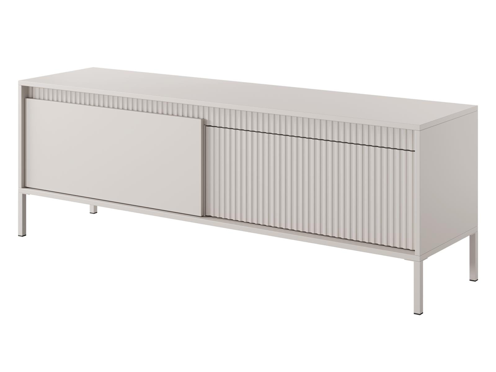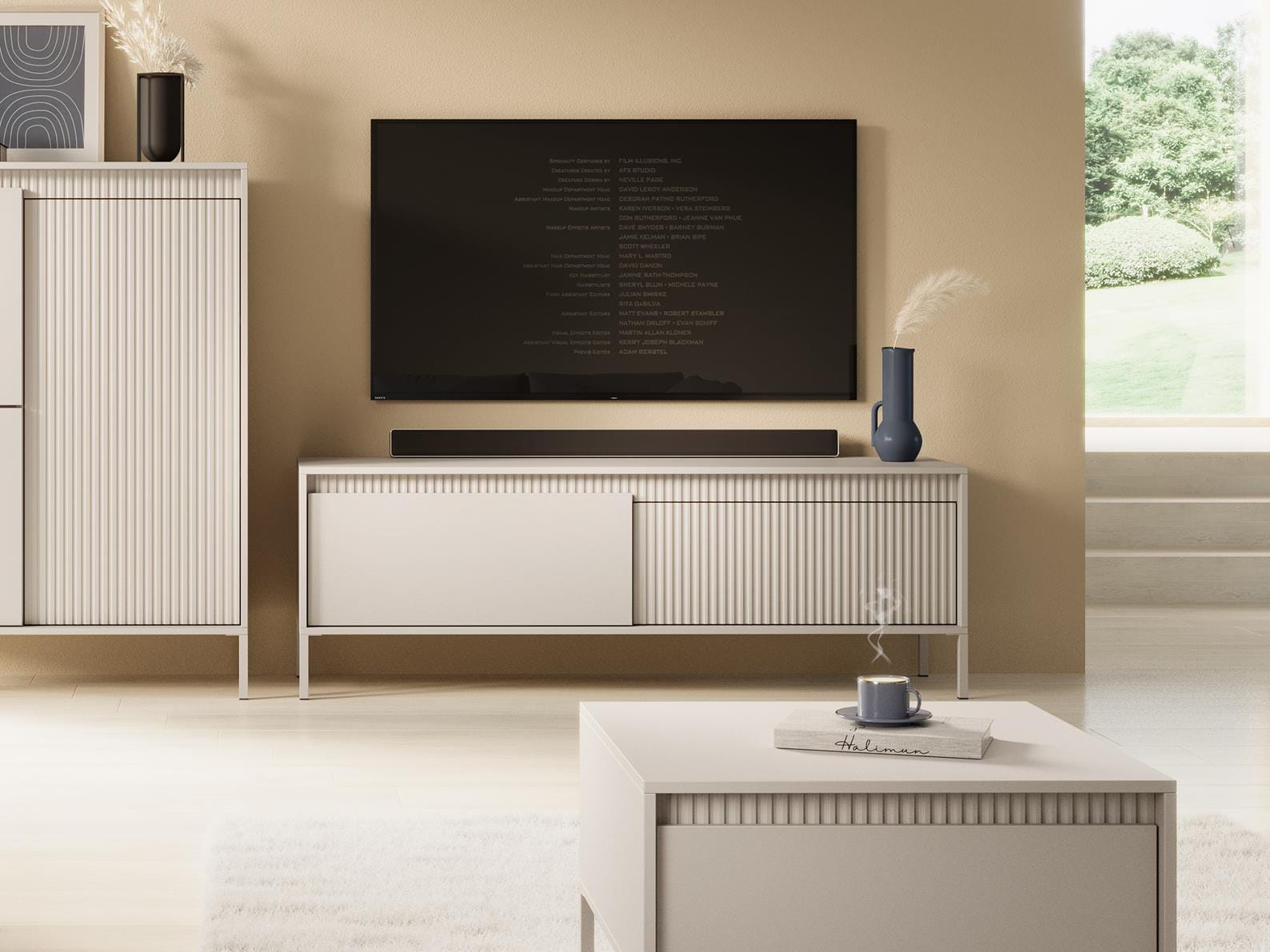 Szafka wyróżnia się dekoracyjnym, ryflowanym frontem, który nadaje jej wyjątkowego charakteru i podkreśla estetykę całego mebla. Delikatna, pionowa struktura w połączeniu z gładkimi powierzchniami tworzy spójną i elegancką całość, która przyciąga uwagę, ale nie dominuje przestrzeni. Jasny kolor dodatkowo optycznie powiększa wnętrze, co czyni ten model idealnym wyborem do mieszkań, apartamentów czy niewielkich salonów.
