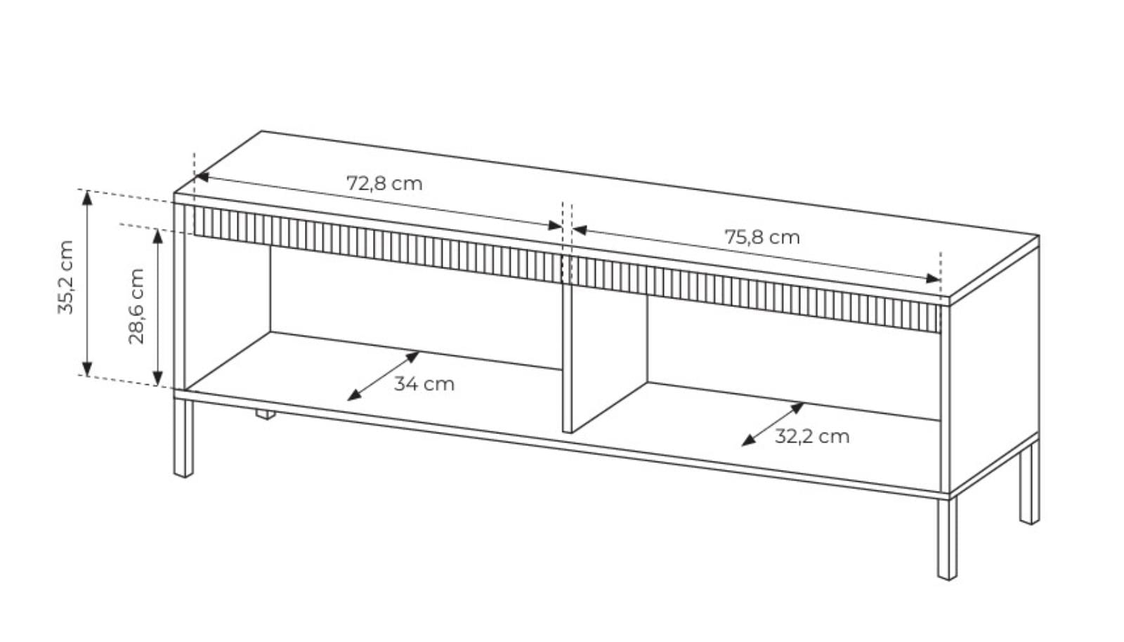 Mimo kompaktowych rozmiarów, szafka RTV oferuje praktyczną przestrzeń do przechowywania. Zamykane fronty pozwalają na wygodne ukrycie sprzętu RTV, kabli oraz akcesoriów, pomagając utrzymać porządek i estetyczny wygląd strefy telewizyjnej. Blat zapewnia stabilne miejsce na telewizor oraz dekoracje, tworząc funkcjonalne centrum domowej rozrywki.