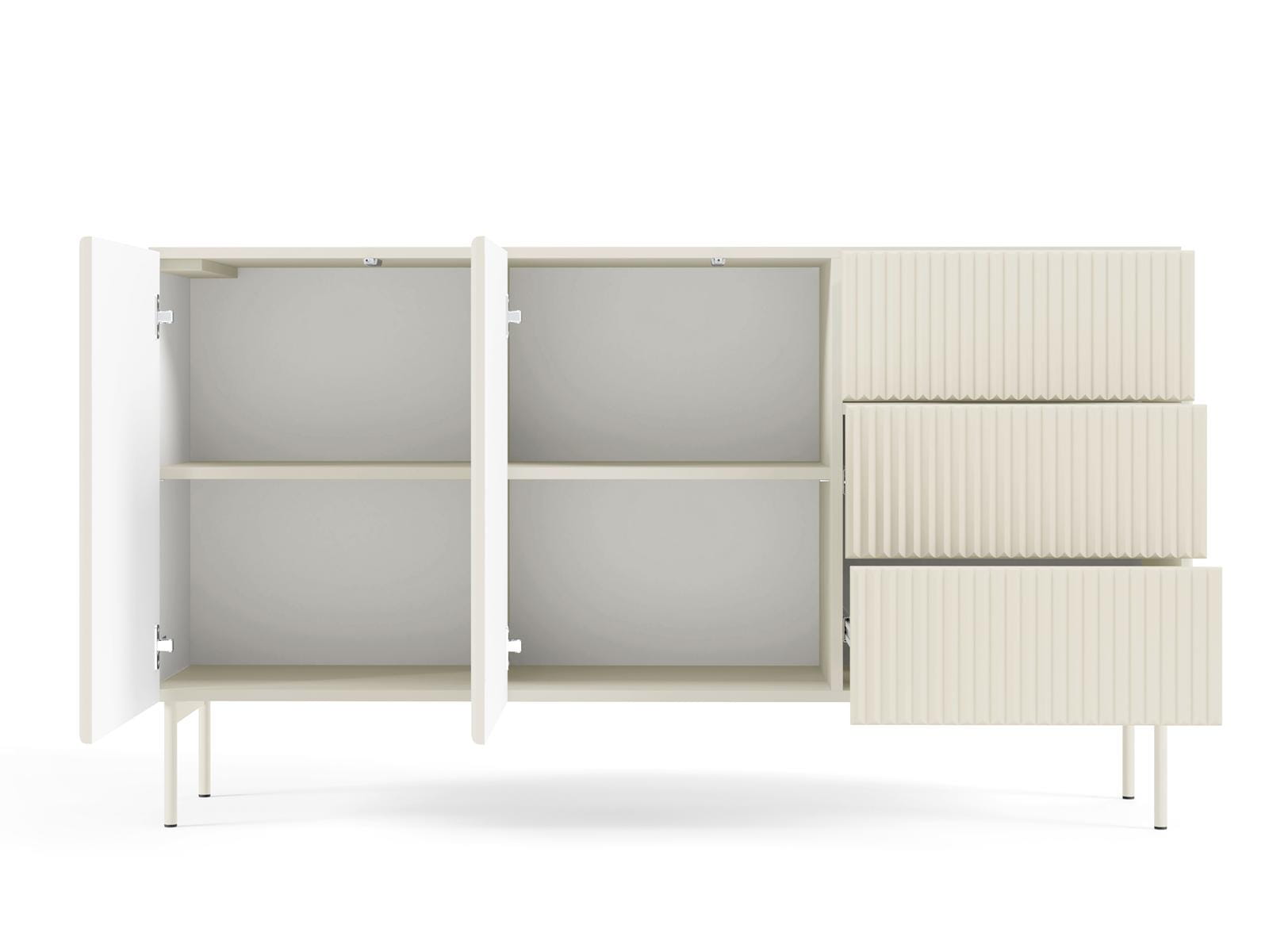 Szerokość 147 cm i przemyślany układ szuflad sprawiają, że pomieści wszystkie potrzebne drobiazgi, dokumenty czy tekstylia. Jej prosta, nowoczesna forma wzbogacona została o frezowane fronty, które subtelnie ożywiają bryłę i nadają jej designerskiego charakteru.
