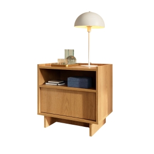 Stylowa szafka nocna w odcieniu karmelowego dębu to doskonałe połączenie minimalistycznego designu, funkcjonalności i naturalnego uroku. Jej kompaktowa forma sprawia, że idealnie sprawdzi się w każdej sypialni, wprowadzając do niej ciepło, harmonię i elegancki charakter.