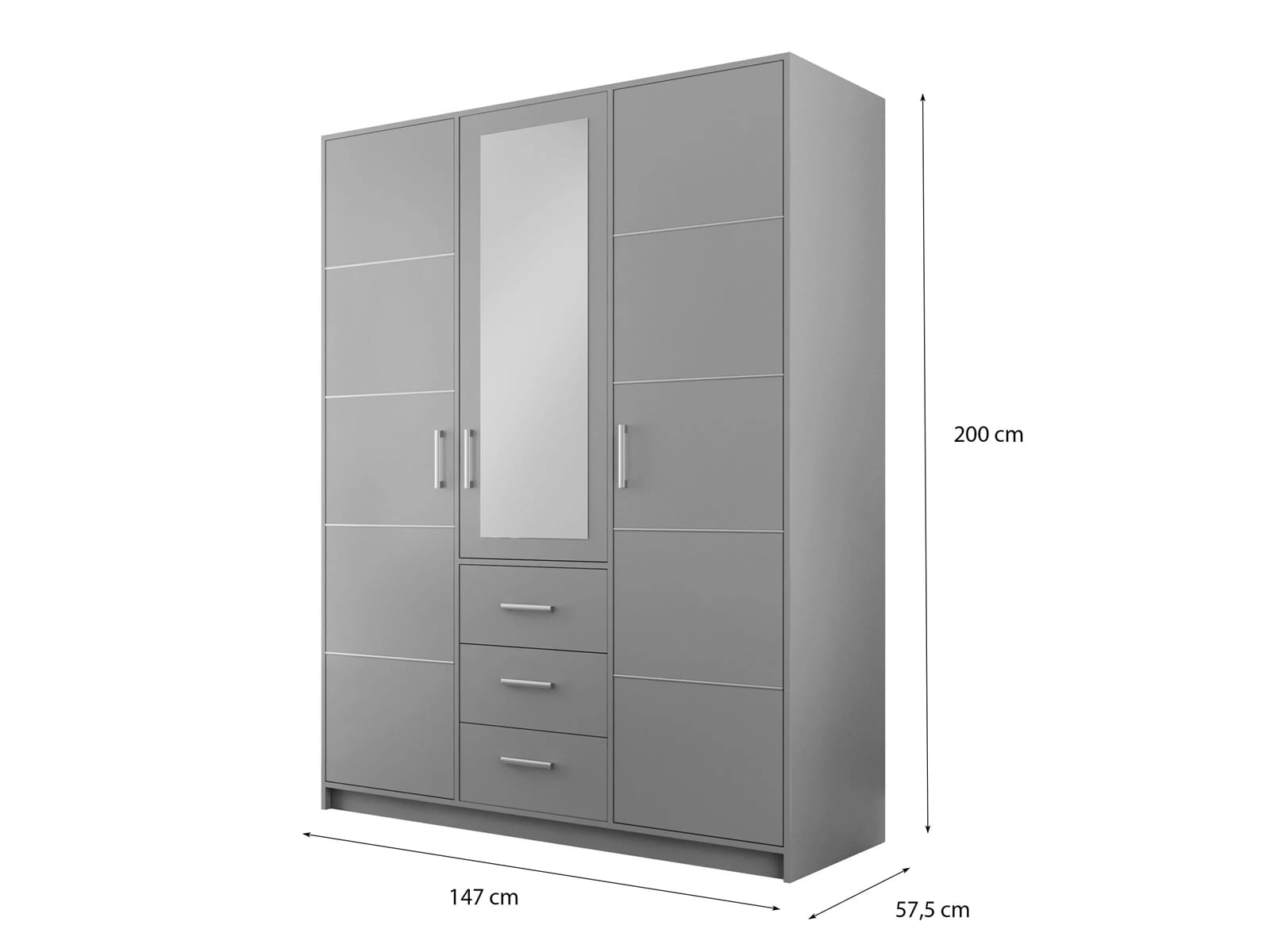 Szafa wyposażona została w 3 drzwi - w tym centralne z lustrem, które optycznie powiększa przestrzeń i dodaje wnętrzu elegancji. To praktyczny dodatek, dzięki któremu można szybko sprawdzić stylizację przed wyjściem. W dolnej części mebla znajdują się 3 pojemne szuflady, idealne na bieliznę, dodatki lub inne drobiazgi.