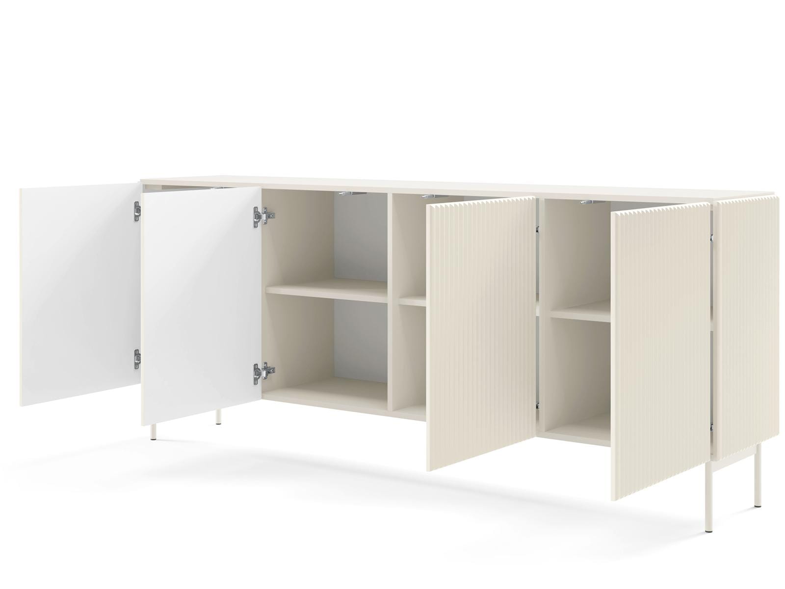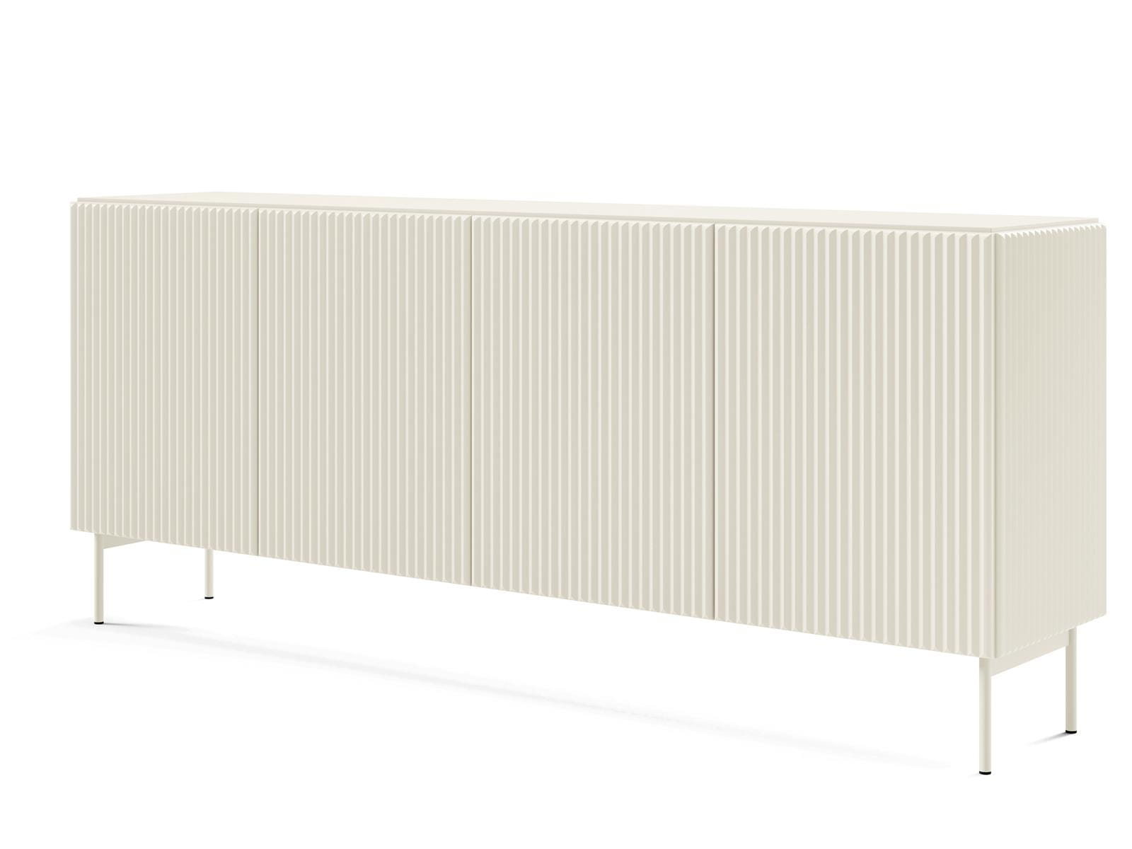 Poznaj komodę, która redefiniuje pojęcie nowoczesnego designu. Stylowa, czterodrzwiowa komoda w modnym kaszmirowym odcieniu to idealne połączenie estetyki, funkcjonalności i solidnego wykonania. Jej ryflowane fronty i wysokie metalowe nóżki tworzą unikalną formę, która doskonale wpisuje się w aktualne trendy wnętrzarskie – od japandi po minimalistyczne.