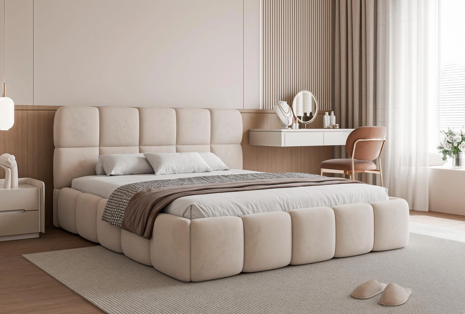Kremowe łóżko to wyjątkowe połączenie nowoczesnego designu, komfortu i funkcjonalności. Wyróżnia się solidną konstrukcją oraz starannie zaprojektowanymi detalami, które nadają mu subtelnego, eleganckiego charakteru. Miękka, przyjemna w dotyku tapicerka w ciepłym, kremowym odcieniu wprowadza do sypialni lekkość, harmonię i przytulną atmosferę, doskonale komponując się z aranżacjami minimalistycznymi, skandynawskimi czy klasycznymi.