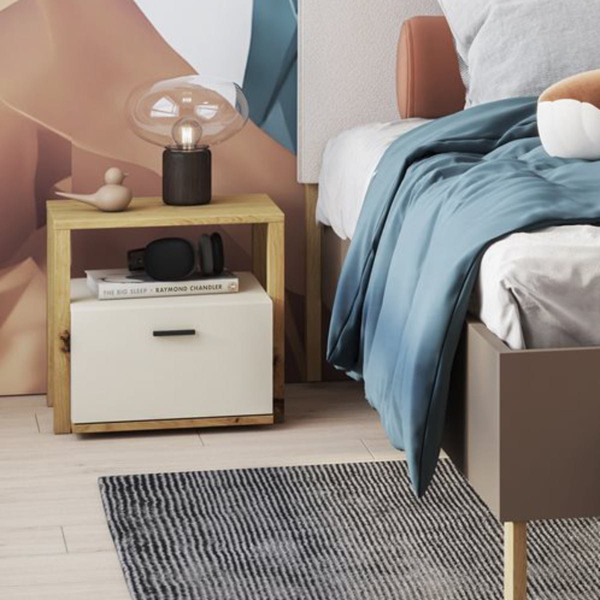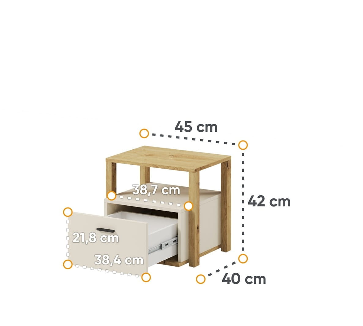 Funkcjonalny stolik nocny - beżowo-drewniane wykończenie