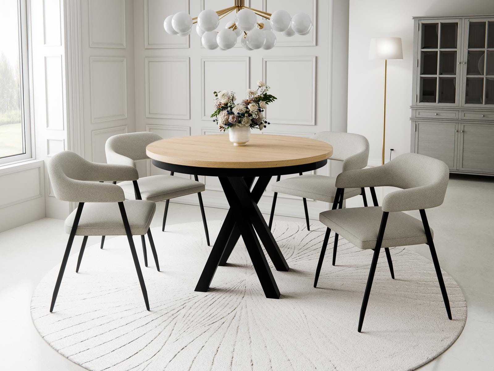 Stół rozkładany LOFTO to idealne połączenie nowoczesnej elegancji z naturalnym ciepłem drewna. Okrągły blat w dekorze dąb hikora zachwyca przytulnym odcieniem, który doskonale komponuje się z solidną, czarną podstawą o designerskiej formie krzyżaka. To mebel stworzony z myślą o funkcjonalności, estetyce i oszczędności miejsca. Perfekcyjny wybór do jadalni, salonu czy aneksu kuchennego.