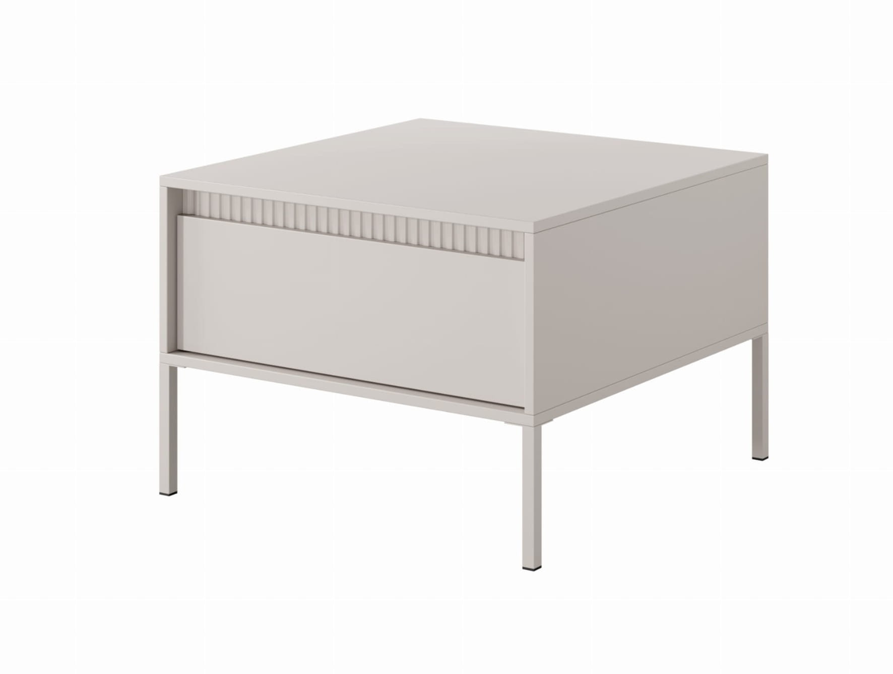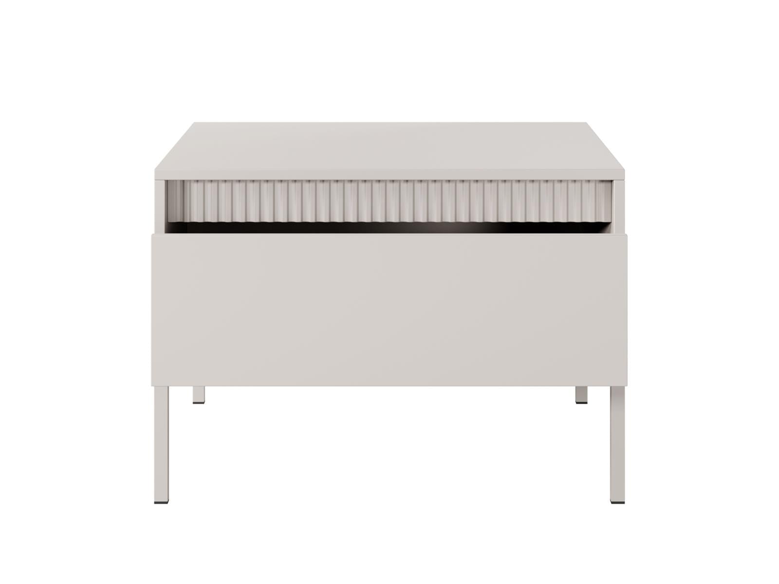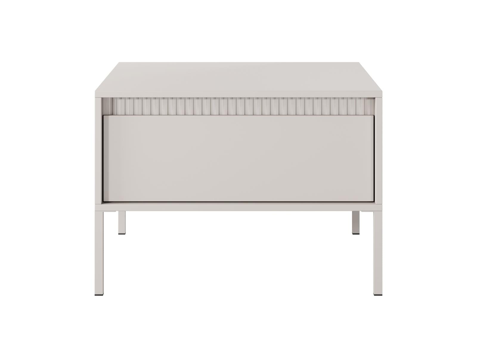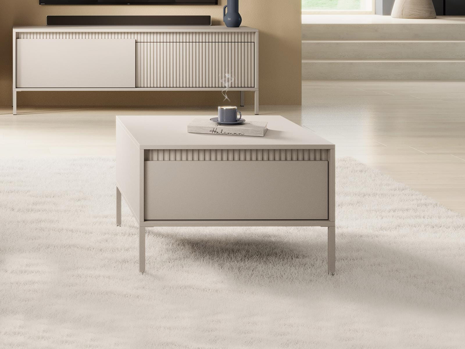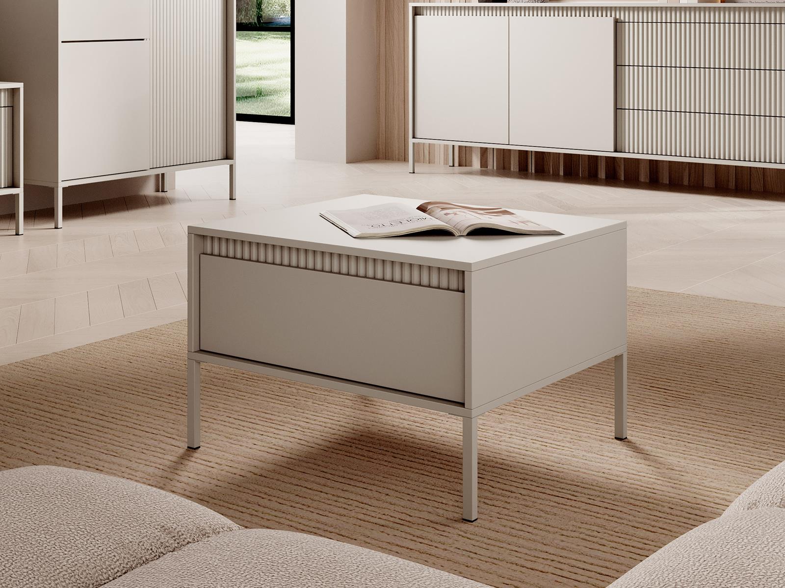 Elegancki stolik kawowy w jasnym, stonowanym odcieniu to idealna propozycja dla osób, które cenią styl, harmonię i funkcjonalność w jednym. Jego minimalistyczna forma została przełamana subtelnym ryflowanym detalem na froncie, który nadaje meblowi wyjątkowego charakteru i przyciąga wzrok, wprowadzając do wnętrza nutę wyrafinowania.