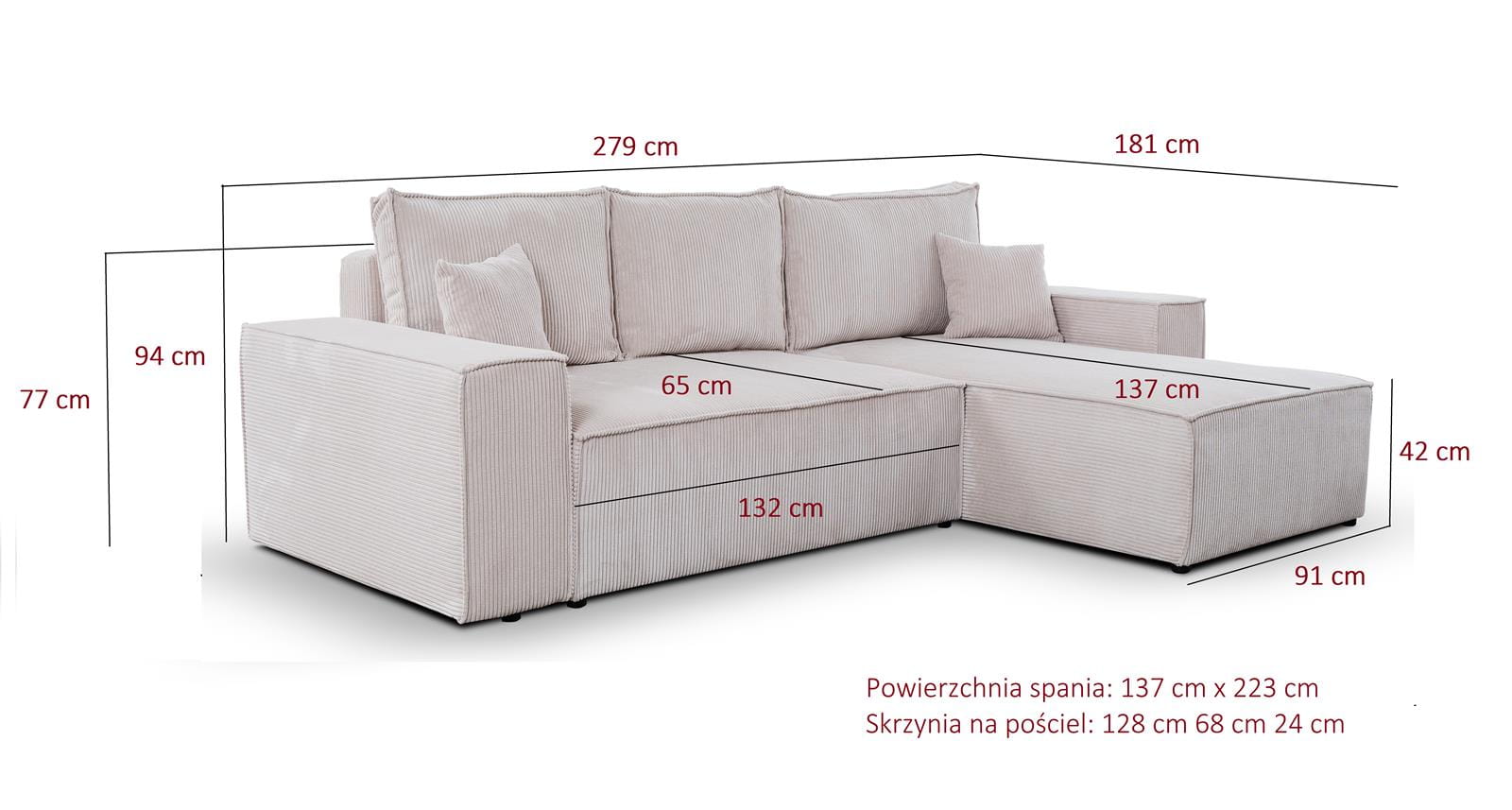 - Duży pojemnik na pościel – dodatkowe miejsce do przechowywania pomaga zachować porządek w salonie.
