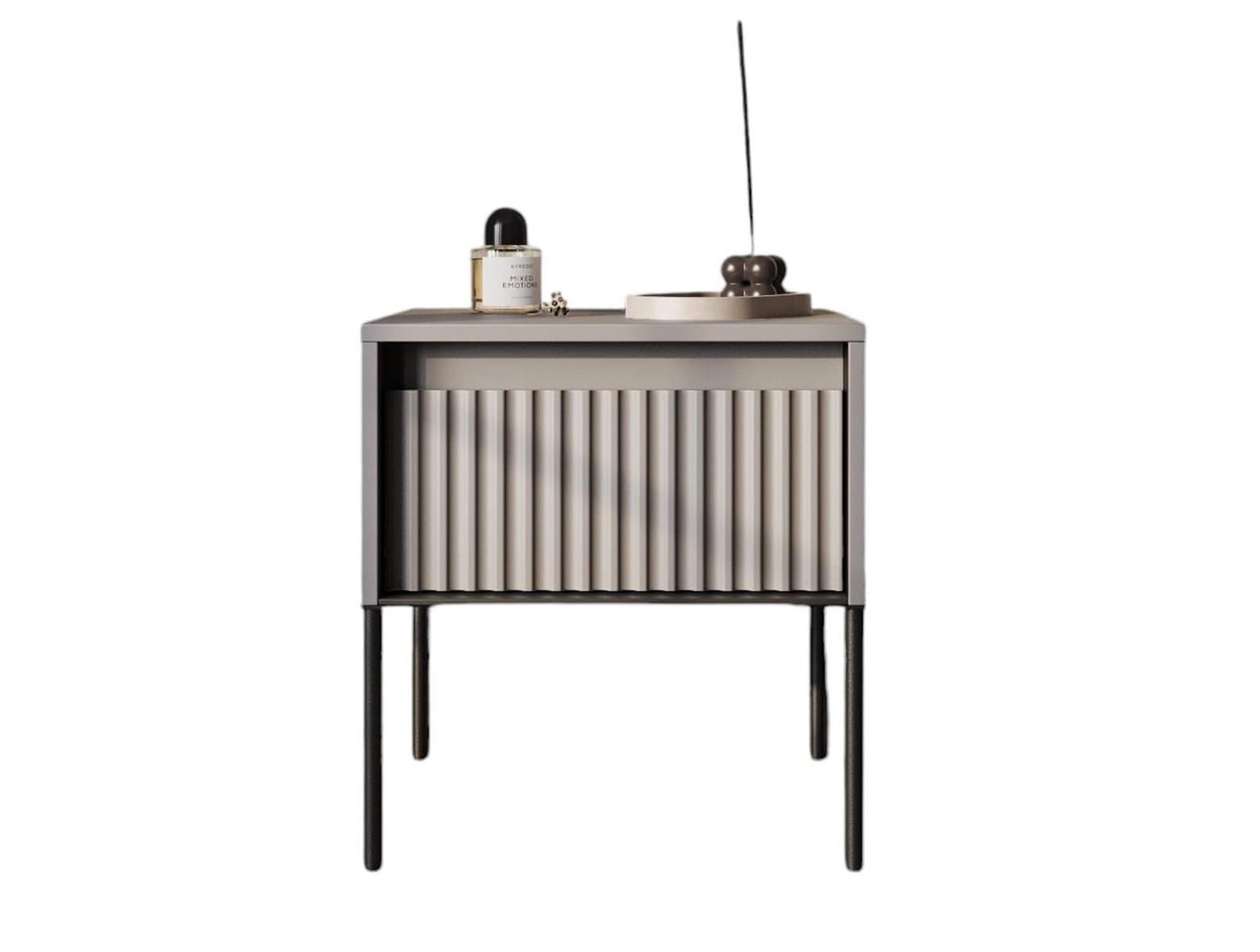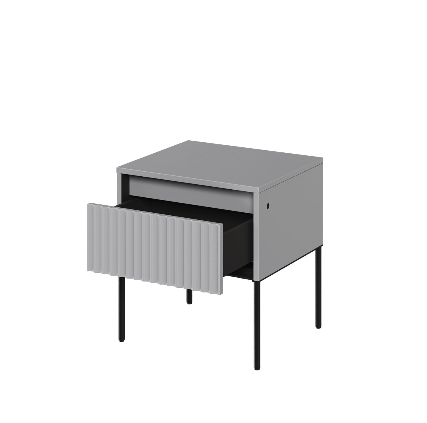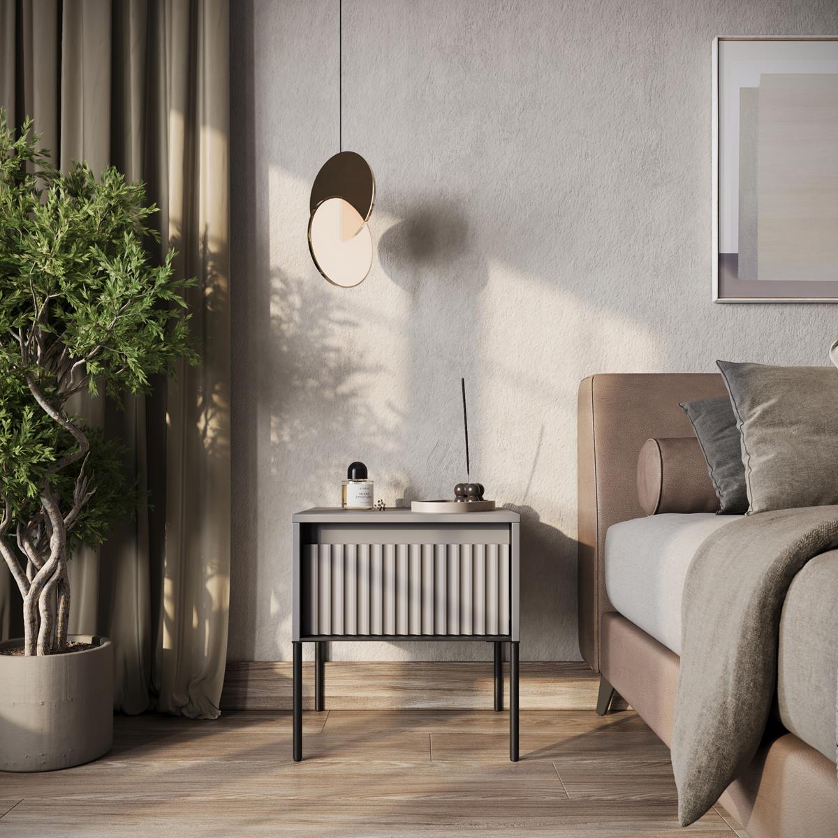 Nowoczesna szafka nocna w kolorze szarym to idealny wybór dla osób ceniących minimalizm i elegancję we wnętrzach. Jej ryflowane fronty w prostej formie dodają charakteru i wpisują się w najnowsze trendy aranżacyjne. Połączenie subtelnej szarości z czarną metalową ramą nadaje całości wyrazistego, loftowego akcentu, który świetnie pasuje do sypialni w stylu nowoczesnym, industrialnym, skandynawskim czy glamour.