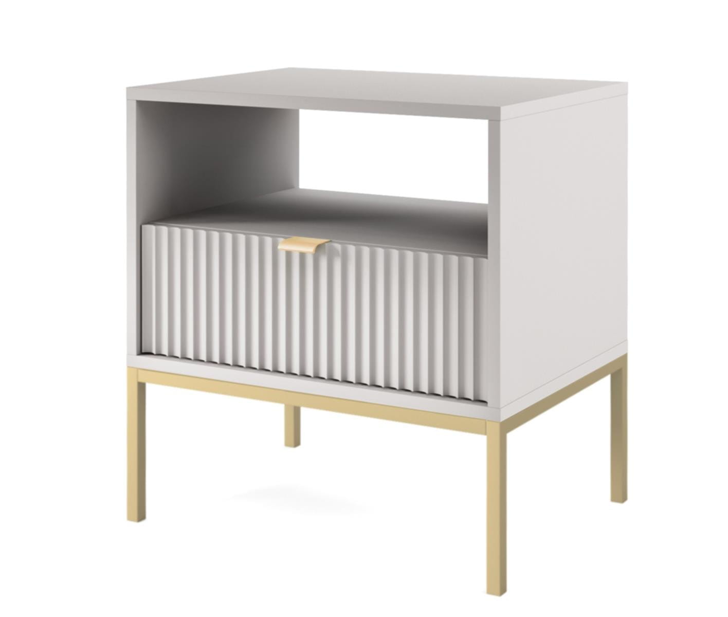 Stolik nocny NANCY to doskonały wybór do każdej sypialni. Ryflowane fronty, będące topowym trendem tego sezonu, nadają meblowi niepowtarzalny wygląd, a złote minimalistyczne uchwyty podkreślają elegancję i luksusowy charakter.
