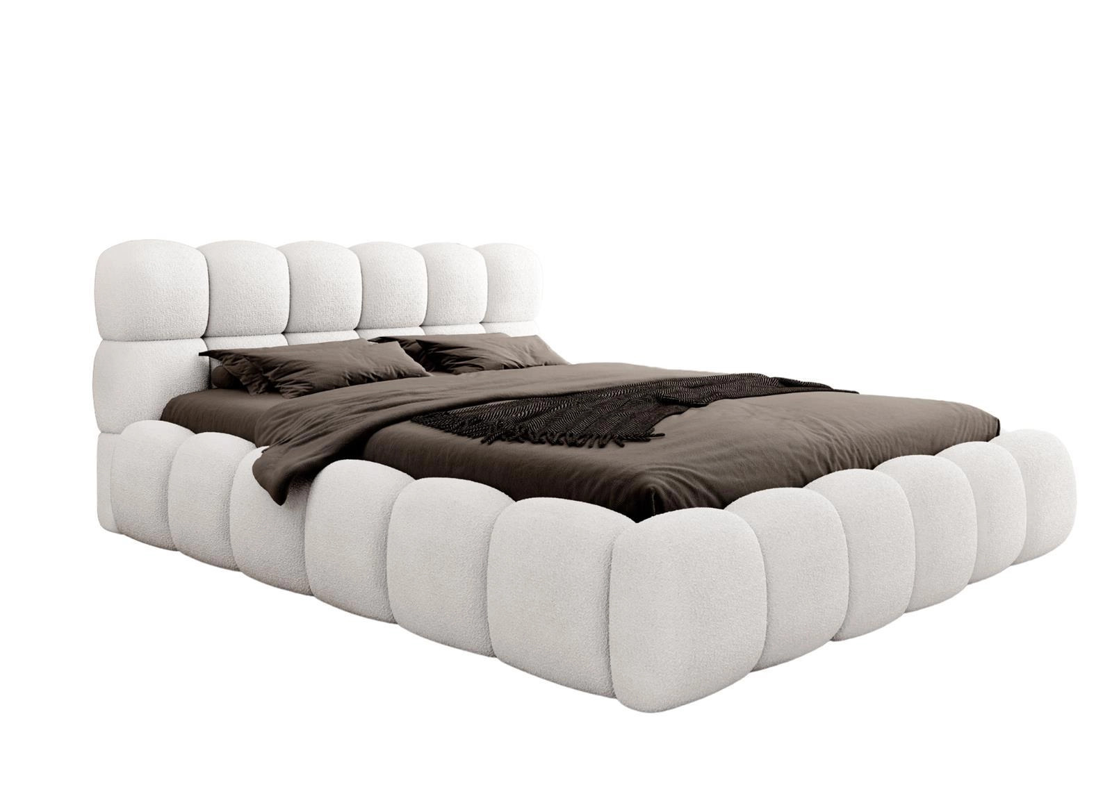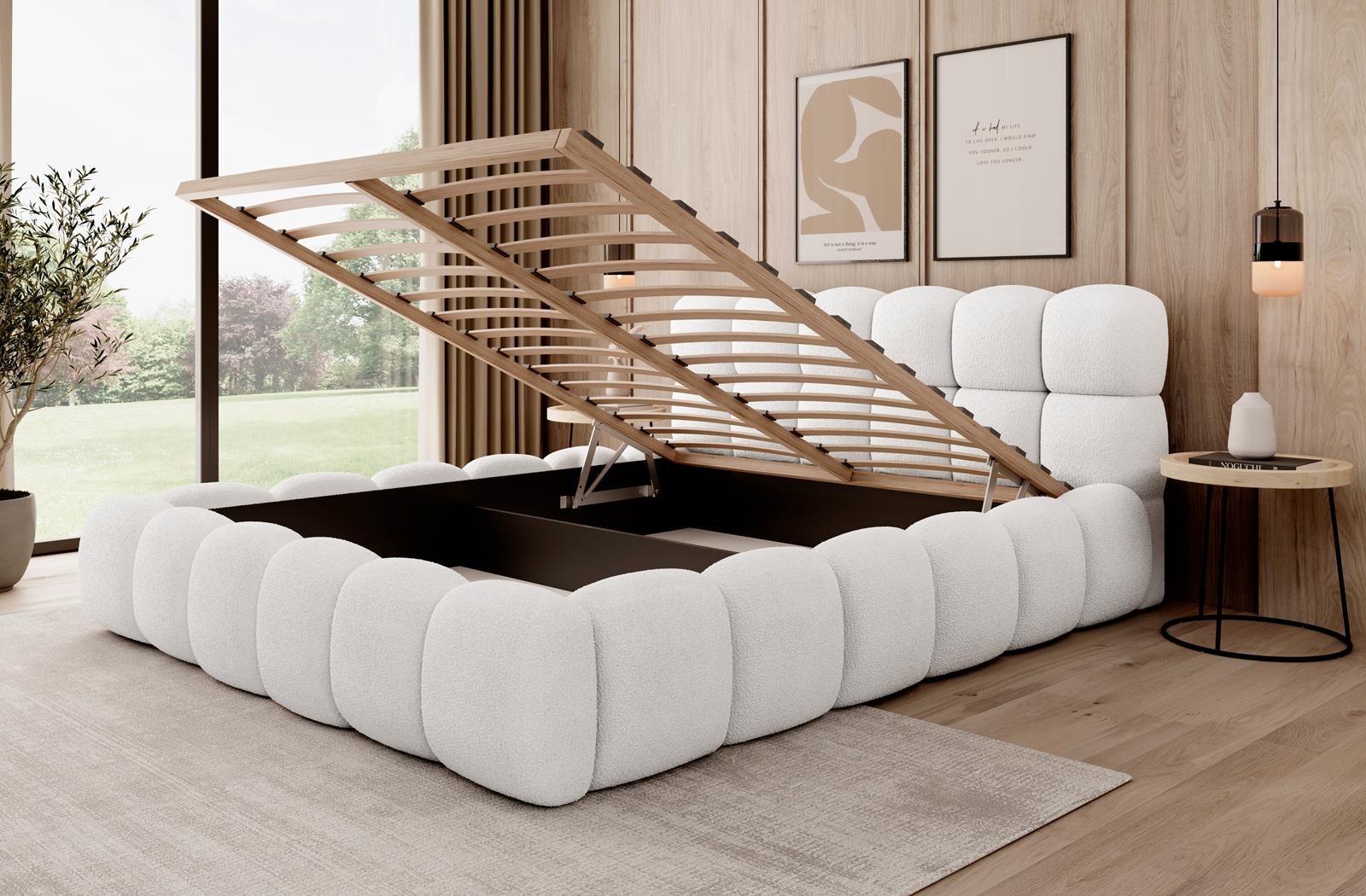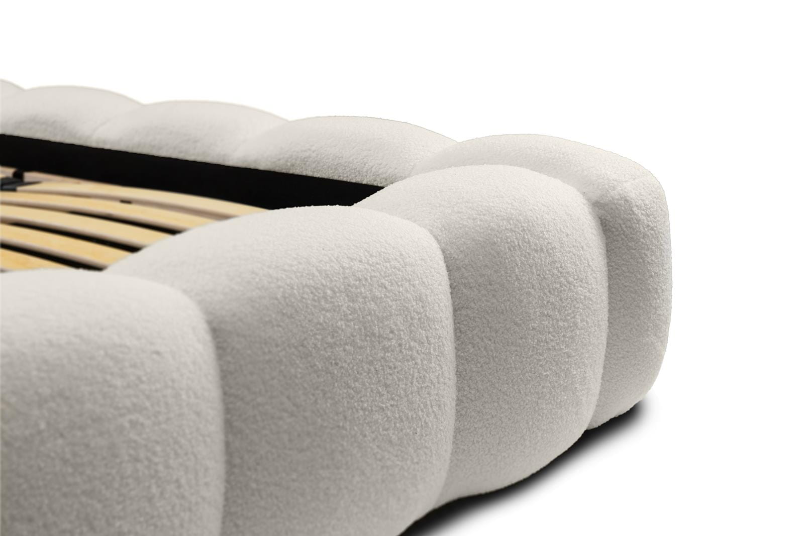 Łóżko zostało obite modnym materiałem boucle, który zachwyca swoją pętelkową strukturą. Jest nie tylko estetyczny, ale także niezwykle przyjemny w dotyku – idealny do stworzenia przytulnej atmosfery.