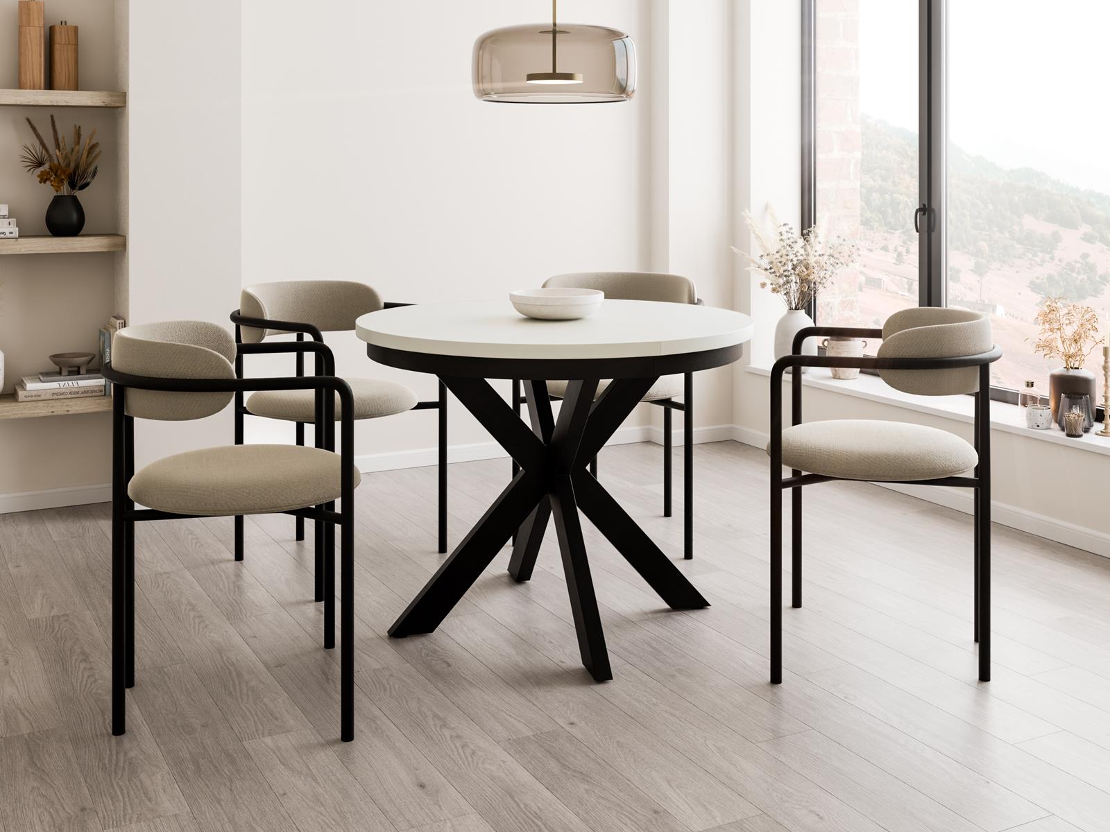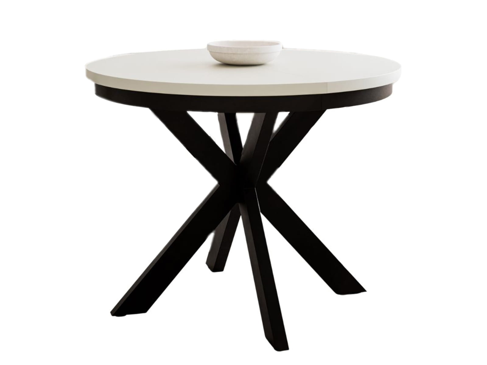 Odkryj okrągły, rozkładany stół z białym blatem i czarną metalową podstawą, który łączy nowoczesną elegancję, kontrastowy design i funkcjonalność. Połączenie jasnego, uniwersalnego blatu z wyrazistą czernią podstawy doskonale wpisuje się w aktualne trendy wnętrzarskie i harmonijnie komponuje się z aranżacjami w stylu nowoczesnym, skandynawskim oraz industrialnym, nadając wnętrzu lekkości i wyrafinowanego charakteru.