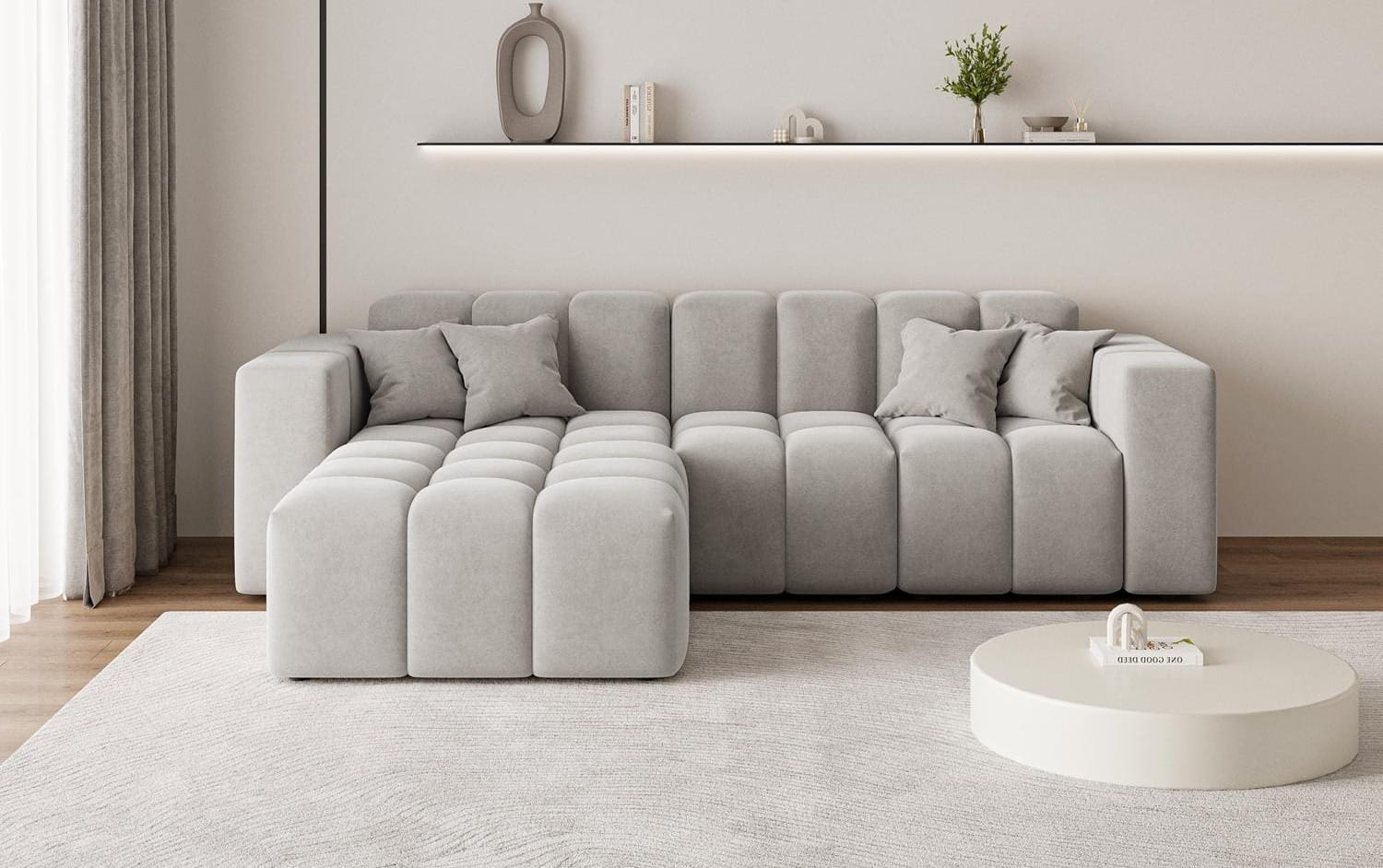 Tkanina Komodo to połączenie miękkości i trwałości. Jej gęsta struktura i delikatny połysk dodają narożnikowi elegancji, a szary kolor sprawia, że wnętrze staje się jasne, przytulne i pełne harmonii.