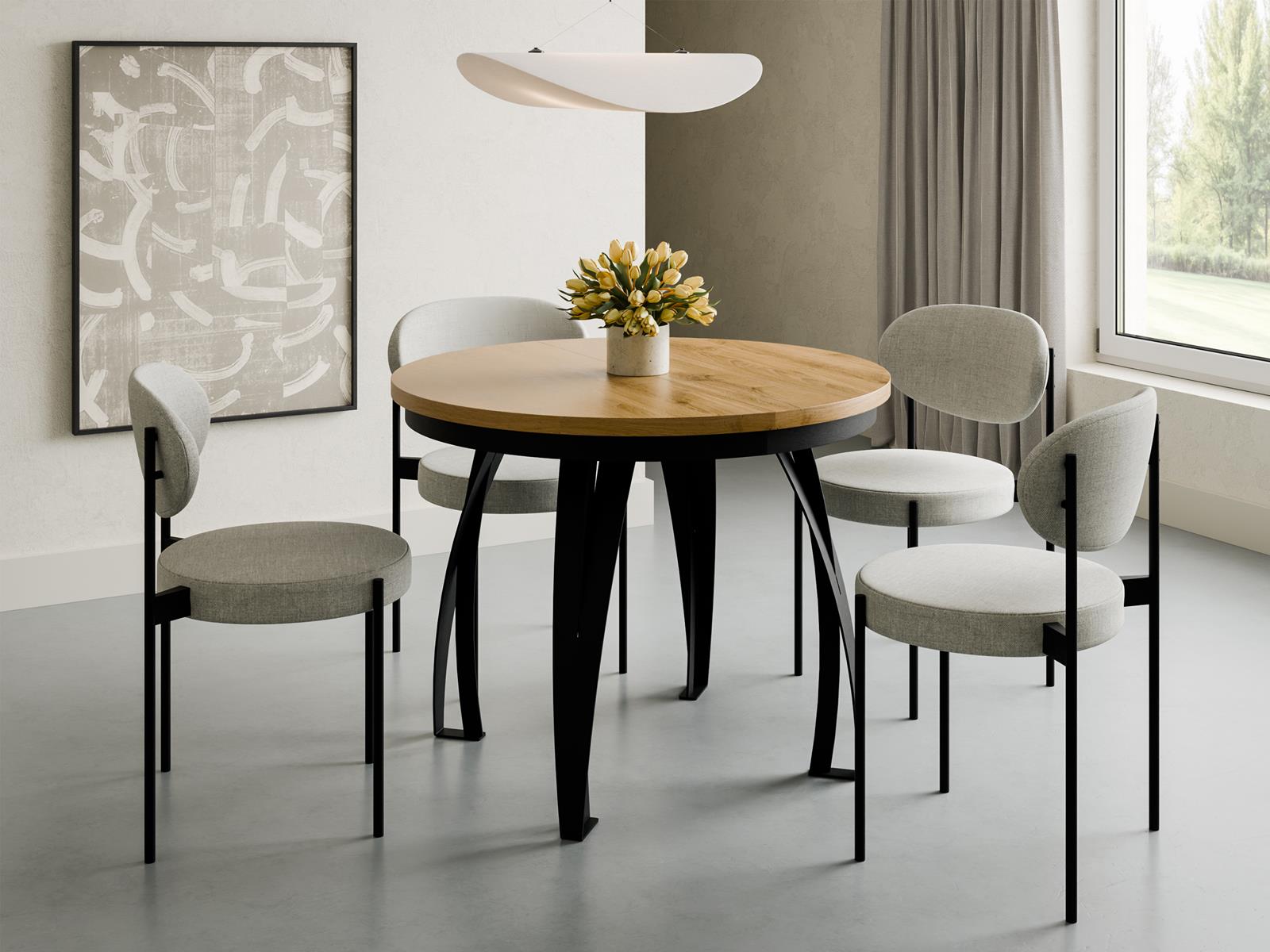 Marzysz o stole, który łączy naturalne piękno drewna z nowoczesnym, industrialnym charakterem? Okrągły, rozkładany stół z blatem w dekorze Dąb Craft na czarnej metalowej podstawie z czterema nogami to doskonały wybór do nowoczesnej kuchni, jadalni lub salonu. Ciepły, drewniany odcień blatu w połączeniu z wyrazistą czernią podstawy nadaje meblowi elegancji i sprawia, że staje się on centralnym punktem wnętrza.
