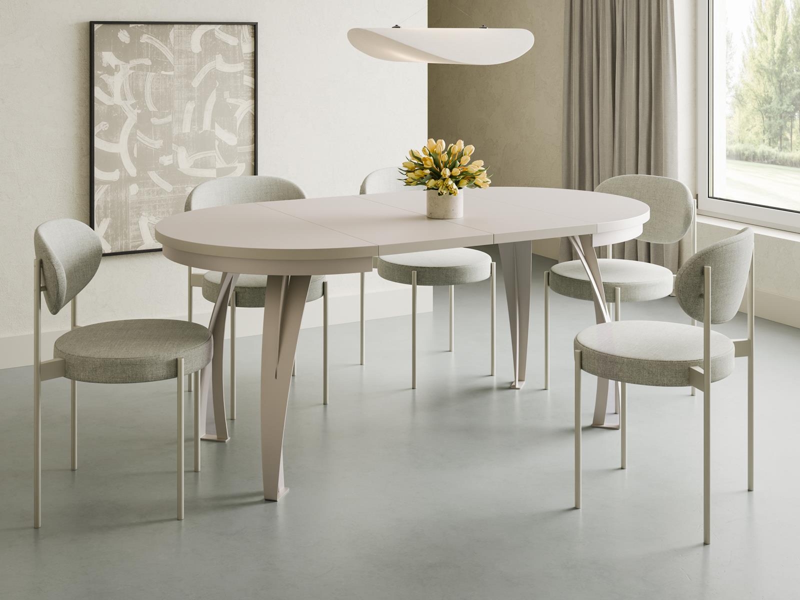Okrągły blat sprzyja wspólnym posiłkom oraz codziennym spotkaniom przy kawie. W wersji podstawowej stół komfortowo pomieści cztery osoby, zapewniając wygodę użytkowania na co dzień. Dzięki praktycznej funkcji rozkładania z łatwością dopasujesz go do większych spotkań rodzinnych, świąt czy wizyt gości.
