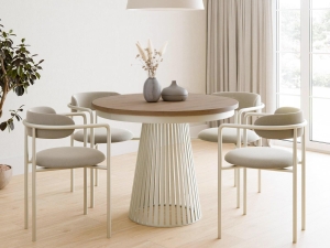 Okrągły kształt stołu sprzyja wygodnej komunikacji i buduje przytulną atmosferę podczas wspólnych posiłków. Designerska podstawa zapewnia stabilność oraz stanowi wyjątkowy element dekoracyjny.