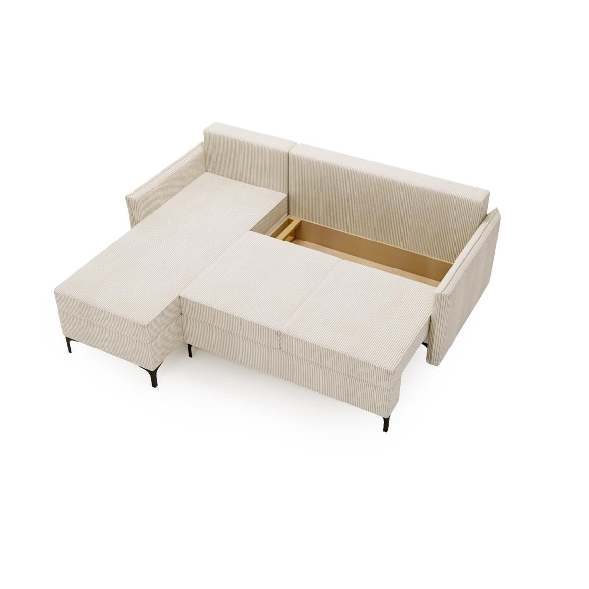 - Funkcja spania: Narożnik można łatwo rozłożyć, uzyskując wygodną powierzchnię do spania o wymiarach 125x200cm, co sprawia, że świetnie sprawdzi się także jako łóżko dla gości.