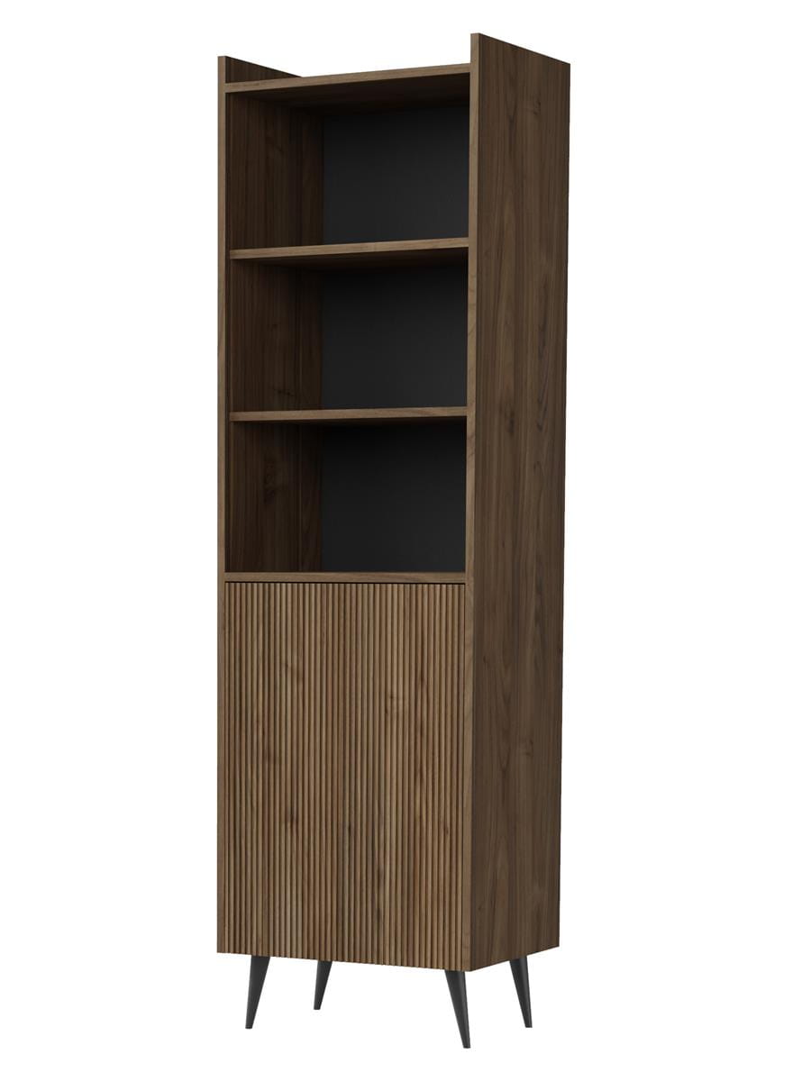 Stabilne, wysokie metalowe nogi w kolorze czarnym nadają meblowi lekkości i ułatwiają utrzymanie czystości pod nim. Minimalistyczny design z subtelnym ryflowanym frontem szafki sprawia, że regał TWINKL doskonale wkomponuje się w aranżacje w stylu skandynawskim, nowoczesnym czy loftowym.