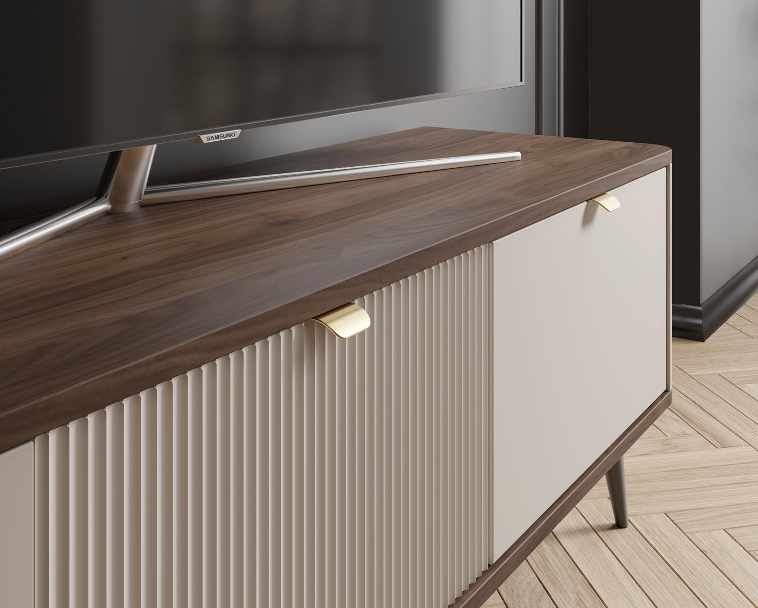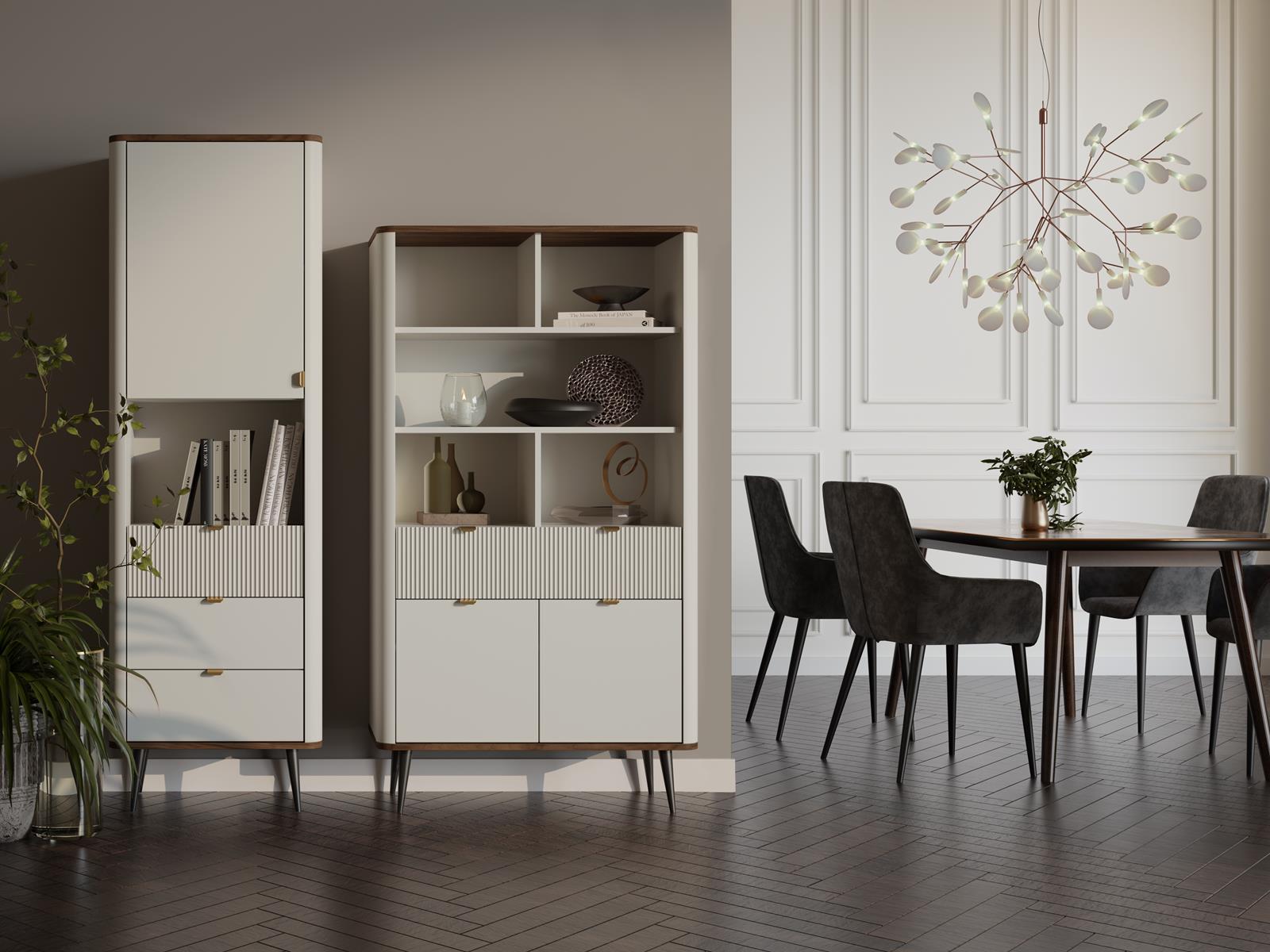 Komoda wyposażona jest w trzy pojemne szuflady, które zapewniają dużą przestrzeń do przechowywania odzieży, akcesoriów, dokumentów czy drobnych przedmiotów codziennego użytku, a ponadto górna szuflada wyróżnia się delikatnym ryflowaniem, nadając całości wyjątkowego charakteru i subtelnego uroku. Wysokie nóżki nie tylko podkreślają lekkość konstrukcji, ale także ułatwiają utrzymanie czystości pod meblem. Komoda jest stabilna, solidnie wykonana i zaprojektowana tak, aby służyła przez lata.