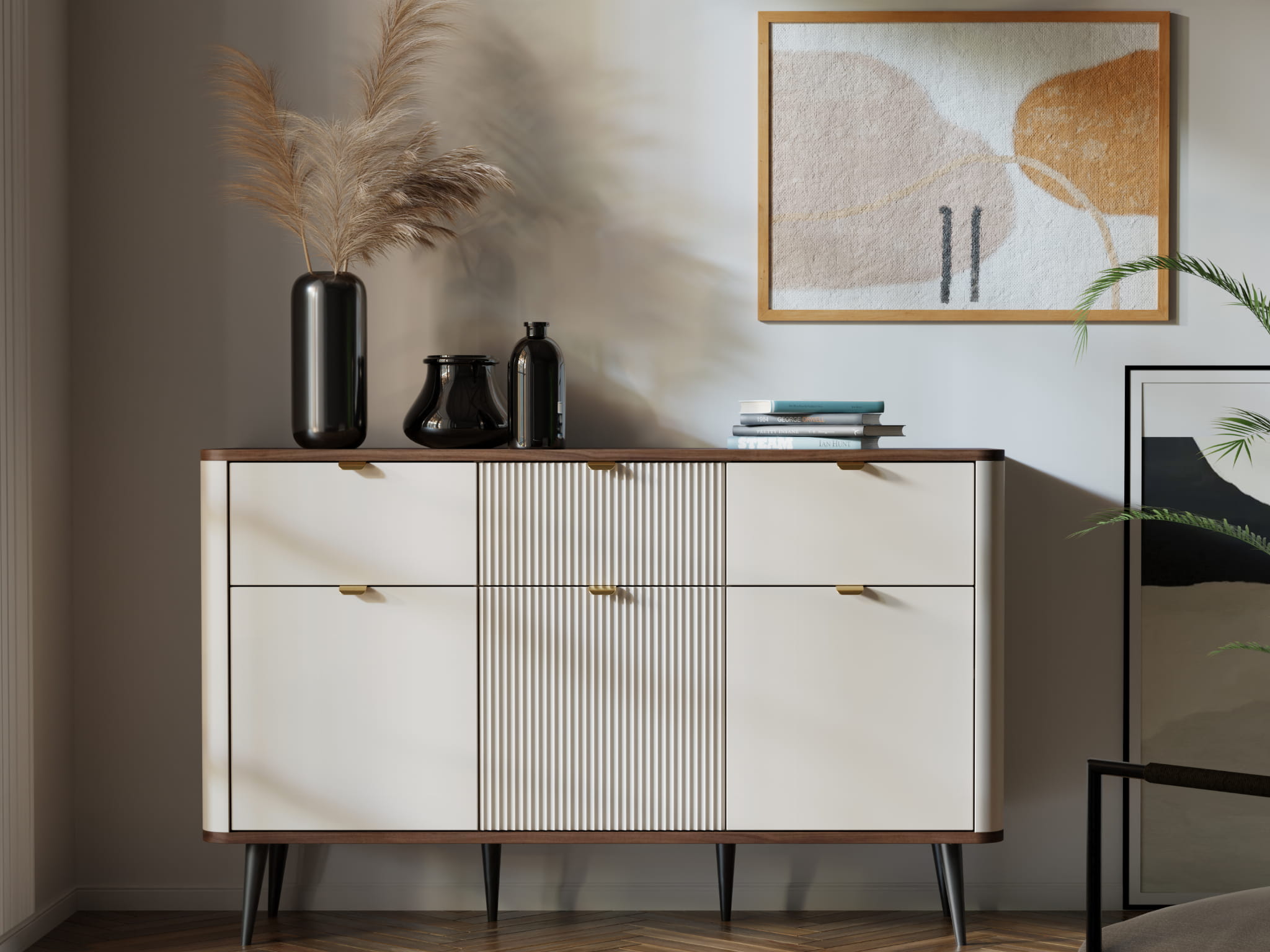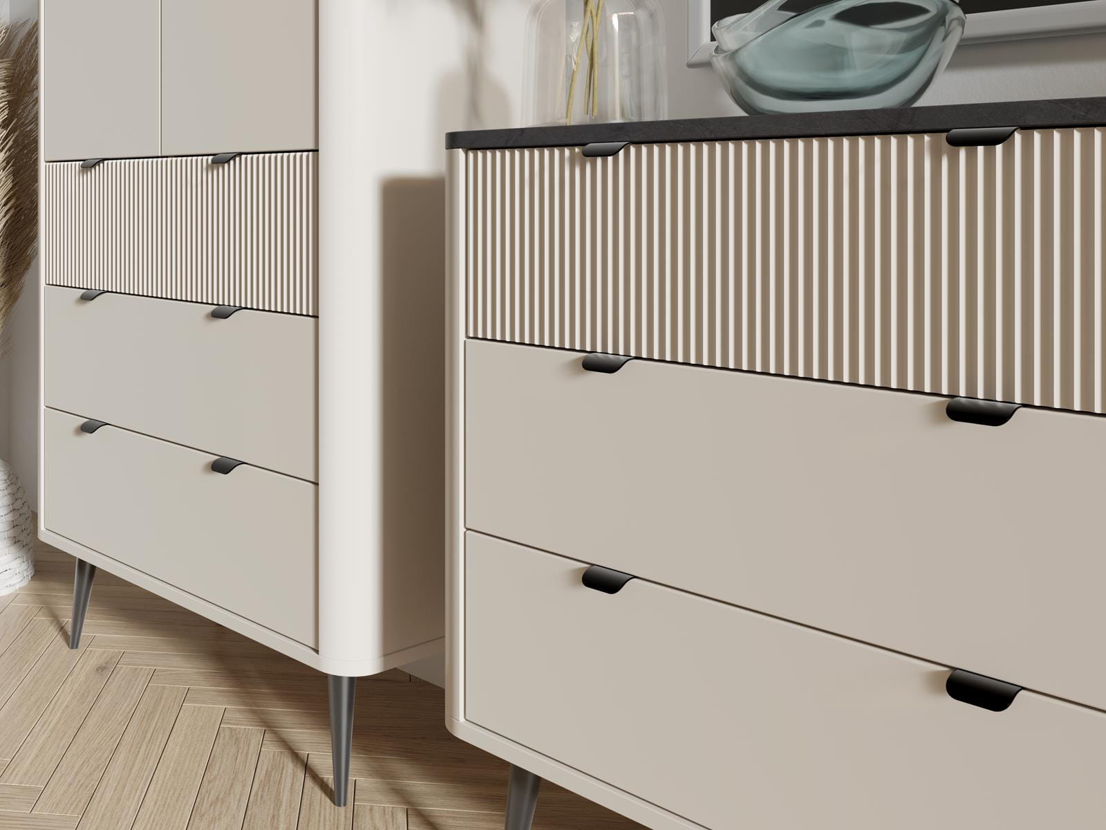 Komoda wyposażona jest w trzy pojemne szuflady, które zapewniają dużą przestrzeń do przechowywania odzieży, akcesoriów, dokumentów czy drobnych przedmiotów codziennego użytku,a ponadto górna szuflada wyróżnia się delikatnym ryflowaniem, nadając całości wyjątkowego charakteru i subtelnego uroku.