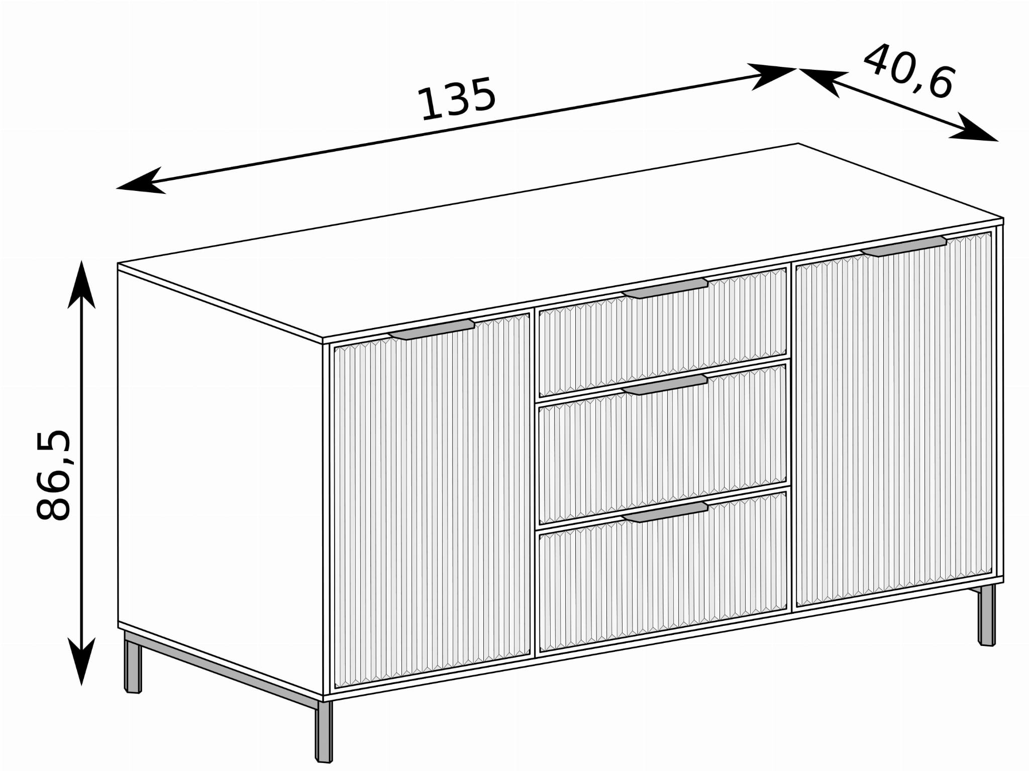 Elegancka komoda z ryflowanym frontem to idealny wybór do stylowego wnętrza. Wyposażona w trzy pojemne szuflady i dwie szafki z drzwiami, oferuje mnóstwo miejsca do przechowywania, dzięki czemu łatwo utrzymasz porządek w salonie lub sypialni. Wysokie nóżki nadają jej lekkości, a ryflowane fronty dodają charakteru i nowoczesnego wyglądu. Wykonana z wysokiej jakości materiałów, komoda będzie zarówno funkcjonalnym, jak i estetycznym dodatkiem do każdego domu.