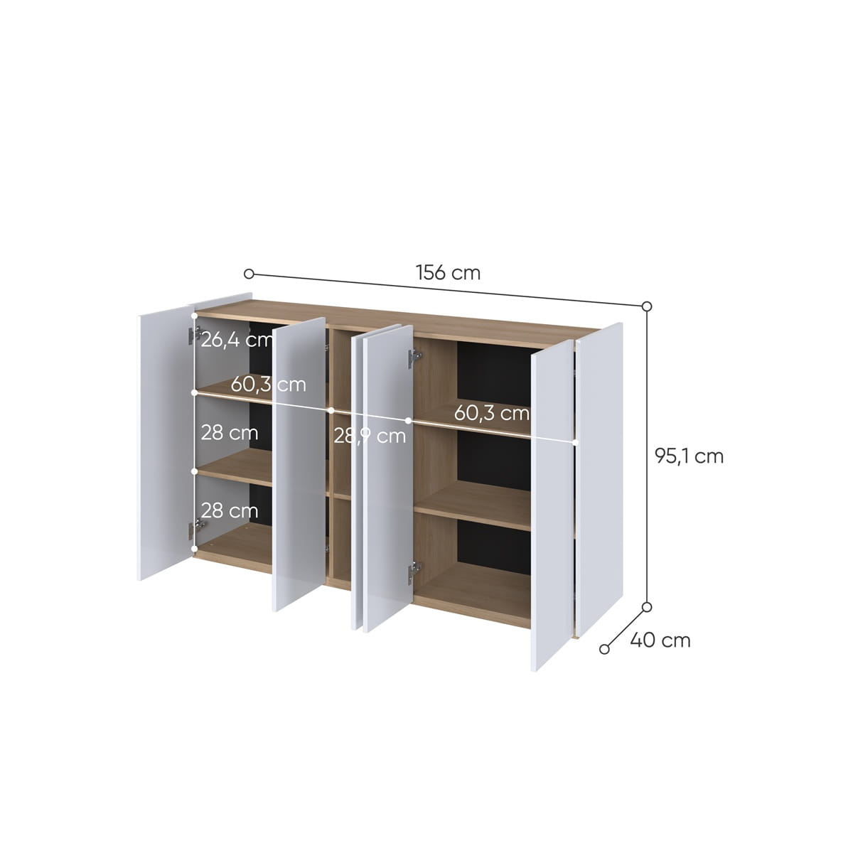 Ciepły odcień dębu scandi wprowadza do pomieszczenia przytulny klimat i doskonale komponuje się zarówno z jasnymi, jak i ciemniejszymi dodatkami. Dzięki temu mebel świetnie sprawdzi się w salonie, jadalni, a także w przestronnej sypialni czy nowoczesnym przedpokoju.