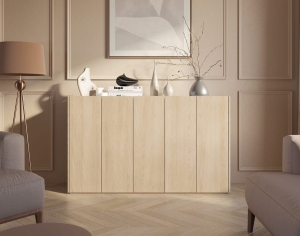 Nowoczesna komoda w kolorze dąb Scandi to idealne rozwiązanie dla miłośników stylu skandynawskiego i naturalnych wnętrz. Jej minimalistyczna bryła oraz 5 praktycznych drzwi zapewniają ogromną przestrzeń do przechowywania - idealną na zastawę, książki, tekstylia czy dokumenty.