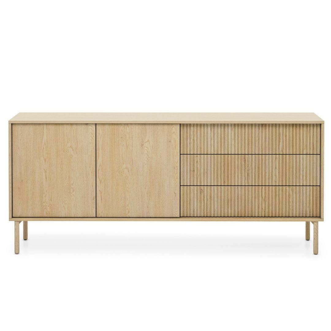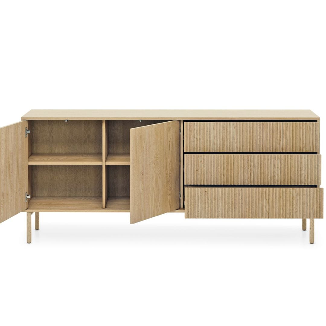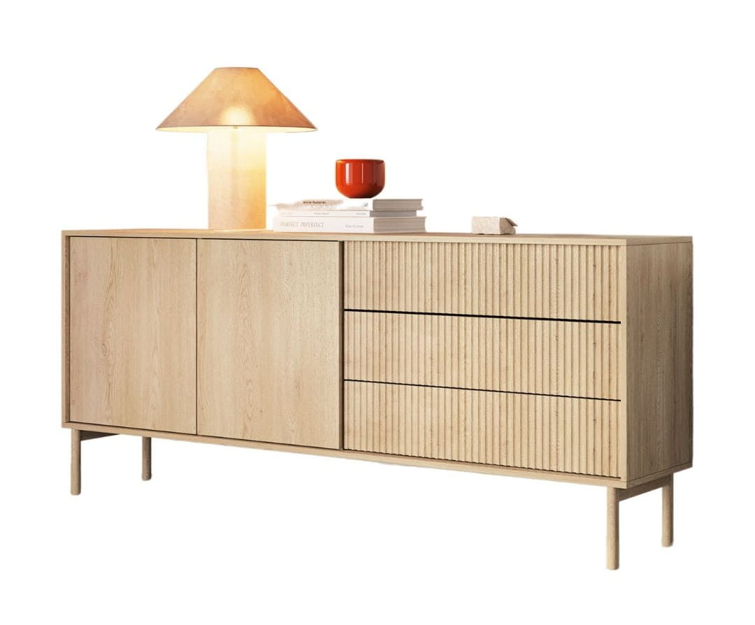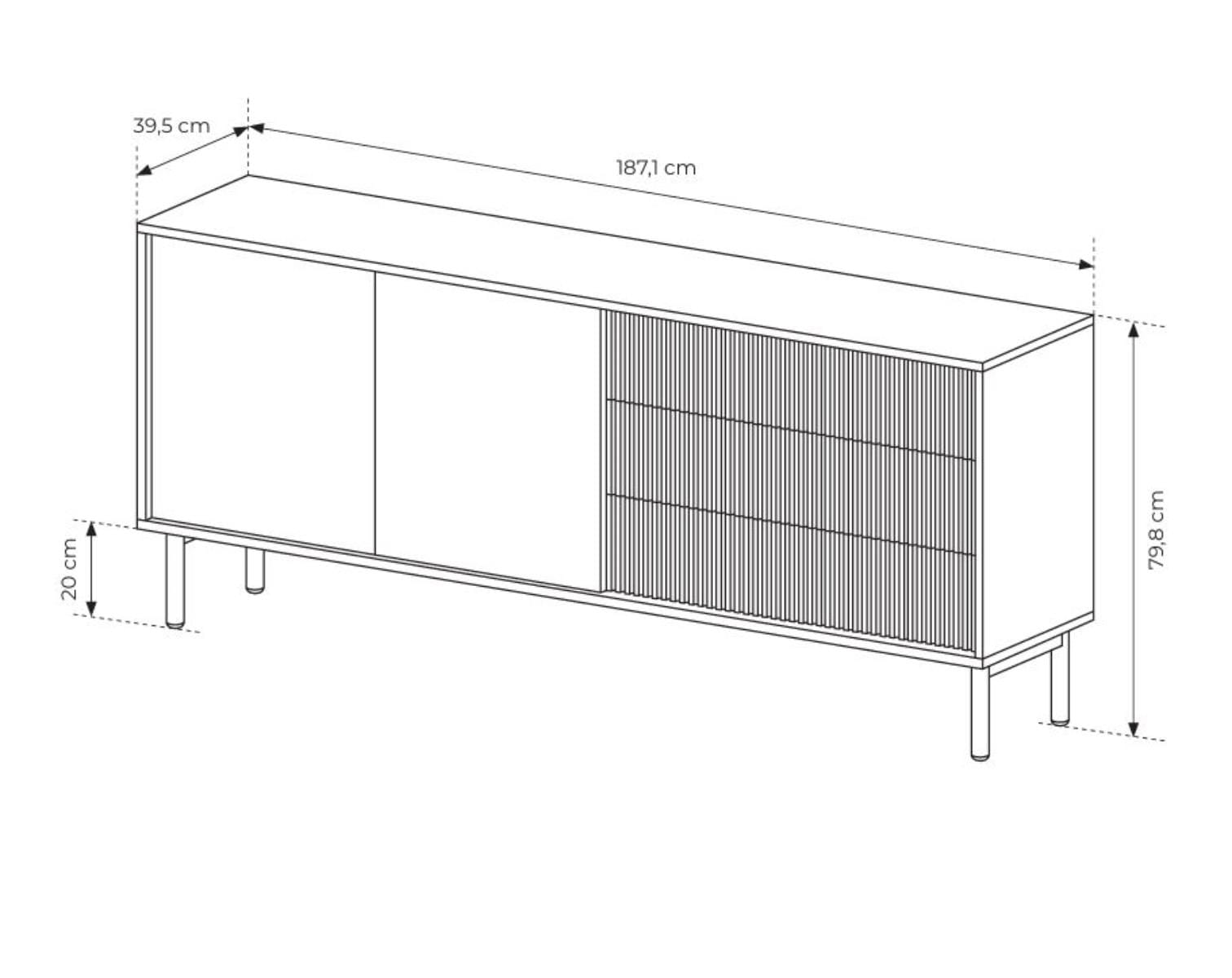 Komoda wyposażona jest w trzy pojemne szuflady z dekoracyjnym frontem ryflowanym, co podkreśla jej nowoczesny charakter. Dodatkowo posiada dwie zamykane szafki z funkcją otwierania typu „push to open”, dzięki czemu korzystanie z niej jest wyjątkowo wygodne i intuicyjne.