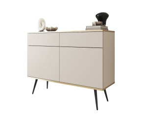 - 2 praktyczne szuflady, wyposażone w system „push to open”, co sprawia, że korzystanie z nich jest łatwe i wygodne. Brak uchwytów podkreśla nowoczesny i minimalistyczny charakter komody.