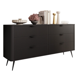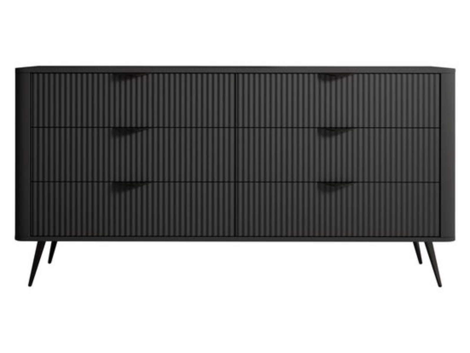 Komoda z szufladami BELLO to idealny wybór dla osób, które szukają stylowego, a jednocześnie niezwykle praktycznego mebla. W nowoczesnym wnętrzu liczy się zarówno design, jak i funkcjonalność – a ta komoda oferuje jedno i drugie w najwyższej formie. Głęboka czarna kolorystyka dodaje meblowi elegancji i wyrazistości. Fronty zdobi subtelne ryflowanie, które tworzy efektowną fakturę i delikatnie rozprasza światło, dzięki czemu mebel staje się interesującym akcentem dekoracyjnym. Zaokrąglone krawędzie przełamują geometryczną bryłę, dodając jej lekkości i czyniąc ją bezpieczniejszą w użytkowaniu.