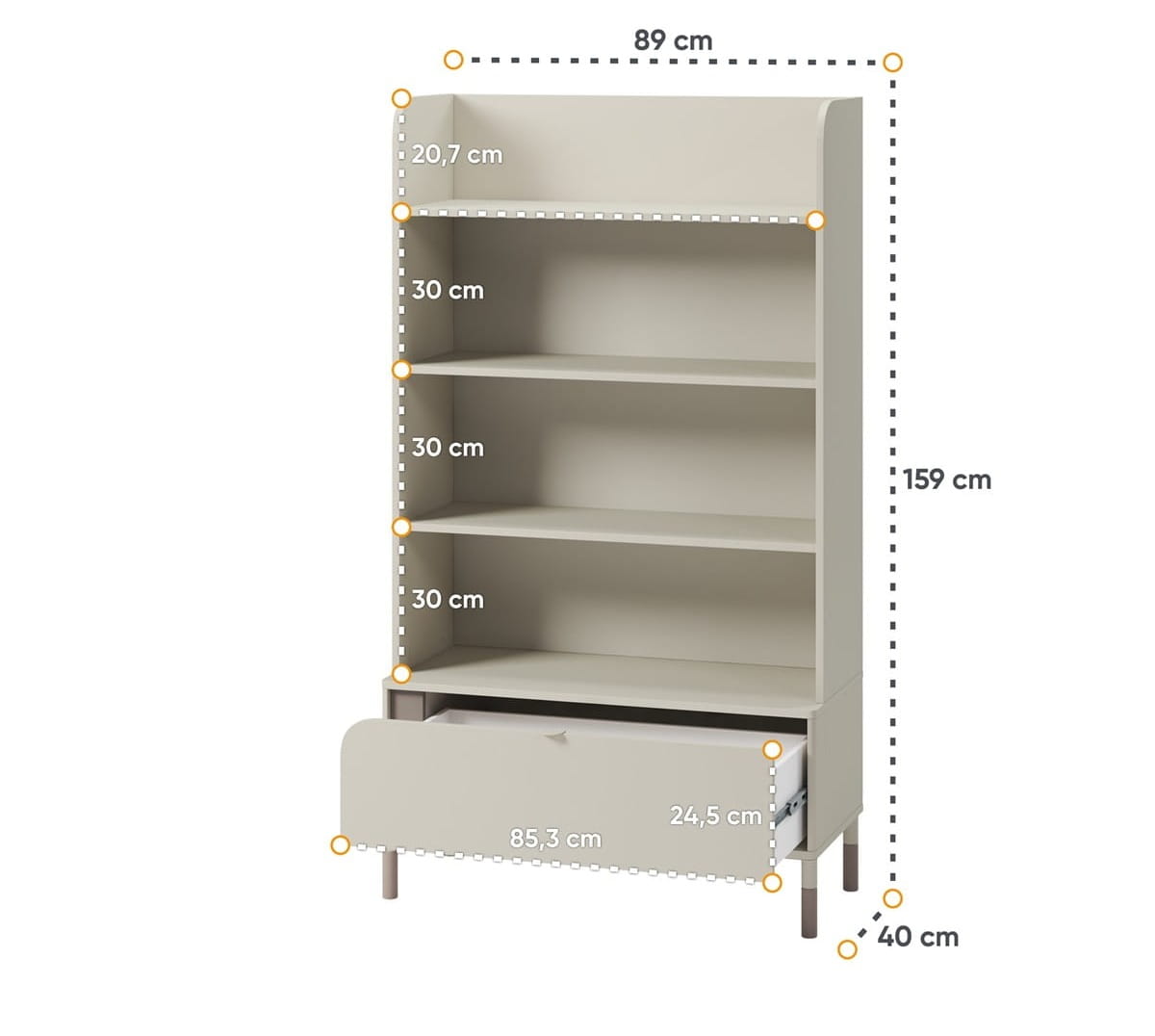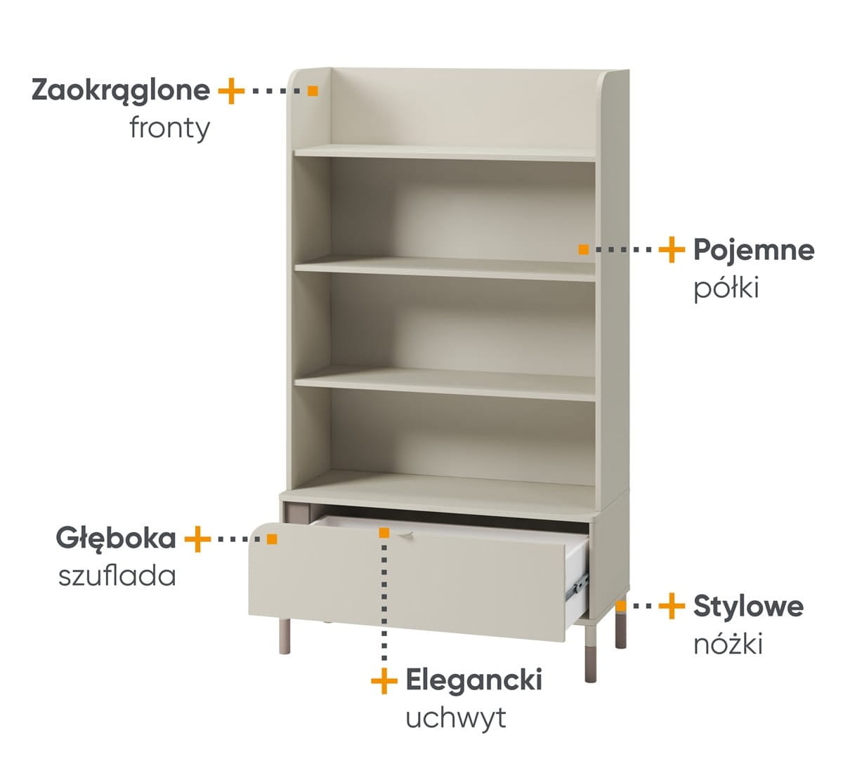 Regał JUNA w kolorze kaszmirowym to funkcjonalny i stylowy mebel, który świetnie sprawdzi się w pokoju dziecka lub nastolatka. Dzięki czterem przestronnym półkom oraz praktycznej szufladzie stanowi idealne miejsce do przechowywania książek, zeszytów, gier, dekoracji czy innych drobiazgów. To regał, który pozwala utrzymać porządek, a jednocześnie pięknie uzupełnia wystrój wnętrza.