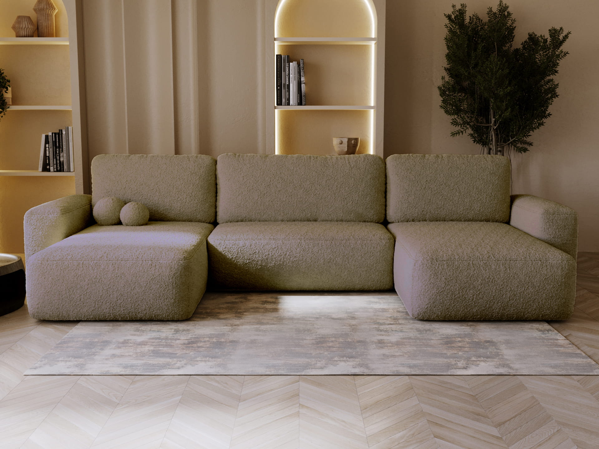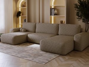 Narożnik w kolorze ciemnego beżu to eleganckie i ponadczasowe rozwiązanie, które doda wnętrzu klasy i przytulnego charakteru. Tkanina typu teddy (bouclé) zachwyca miękkością i unikalną fakturą, dzięki czemu narożnik jest niezwykle komfortowy i przyjemny w użytkowaniu. Ciemny beż świetnie sprawdza się zarówno w jasnych, minimalistycznych aranżacjach, jak i w bardziej wyrazistych, nowoczesnych przestrzeniach - tworząc ciepły i luksusowy klimat.