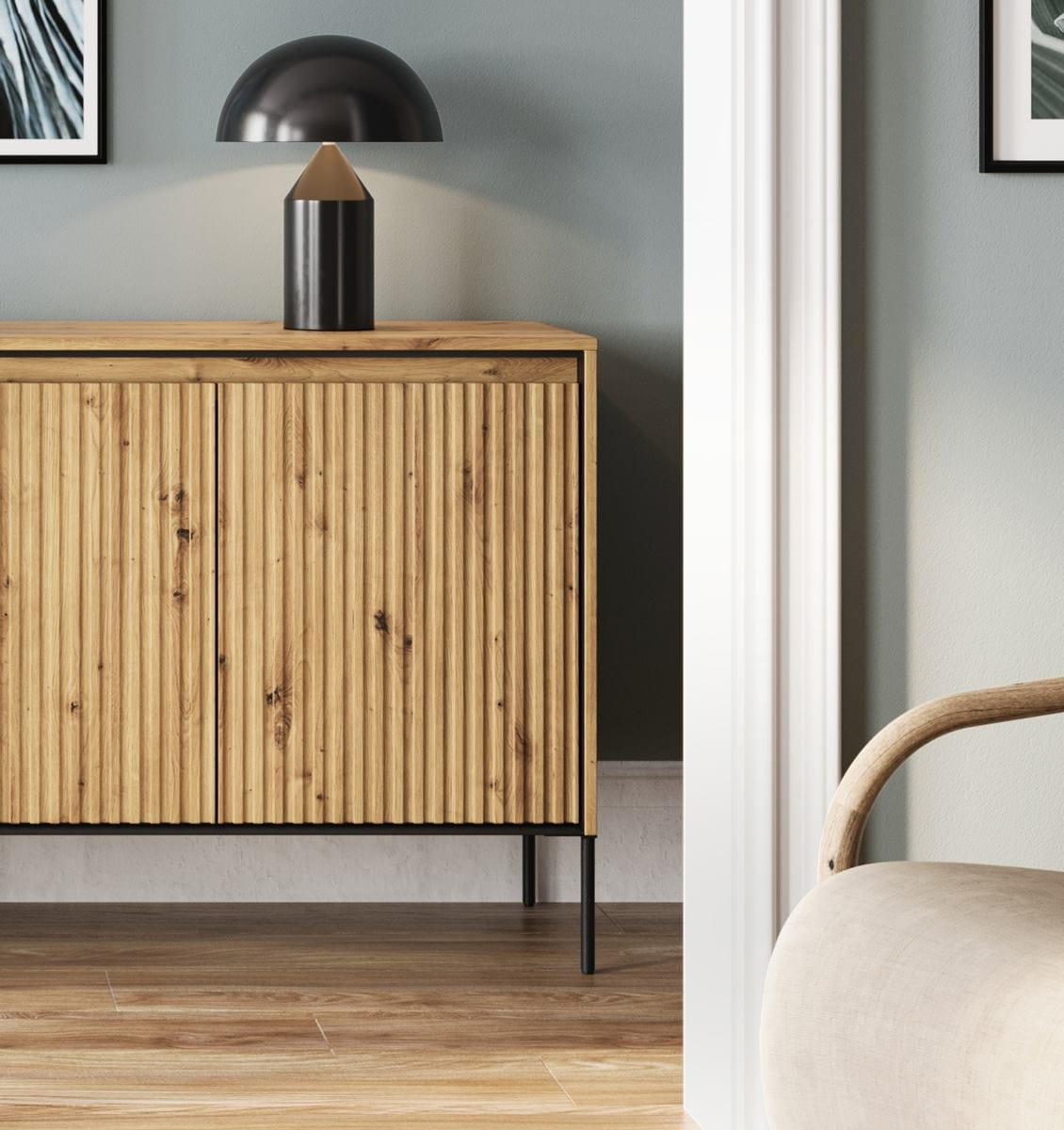Ryflowana komoda w kolorze dąb artisan na metalowych nóżkach FLORES
