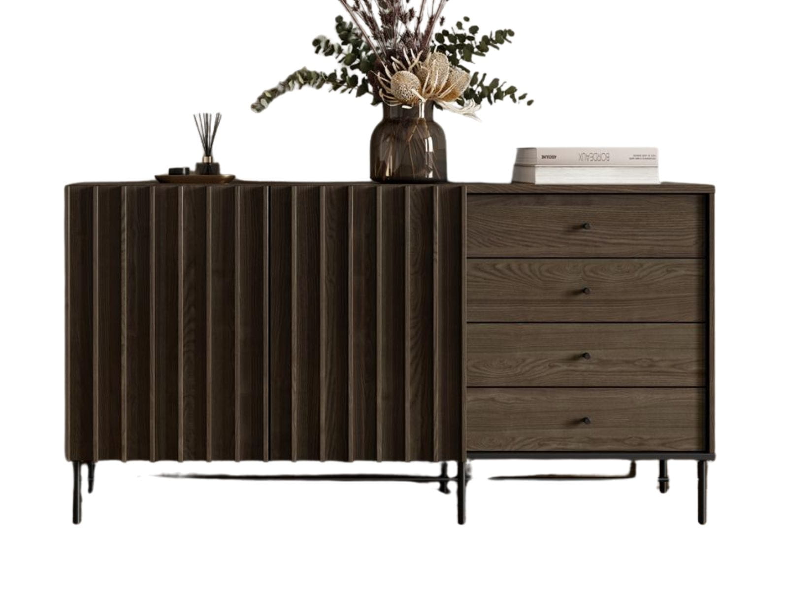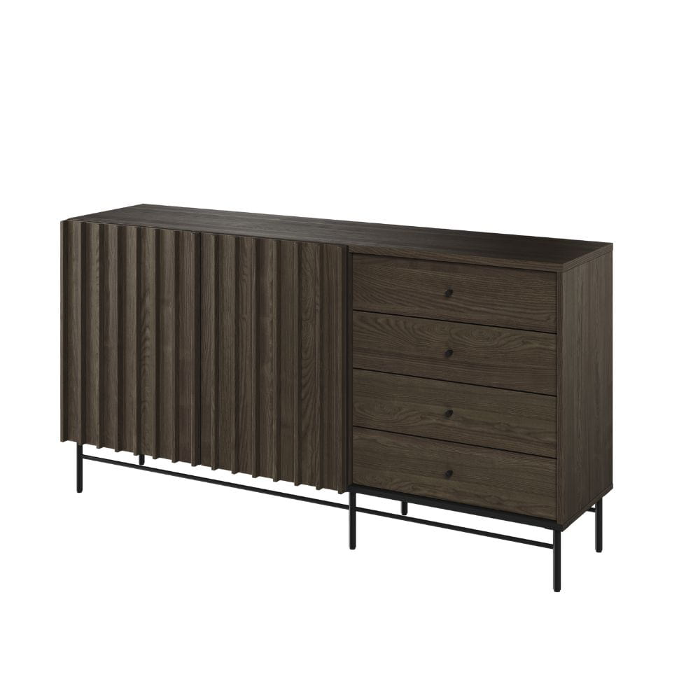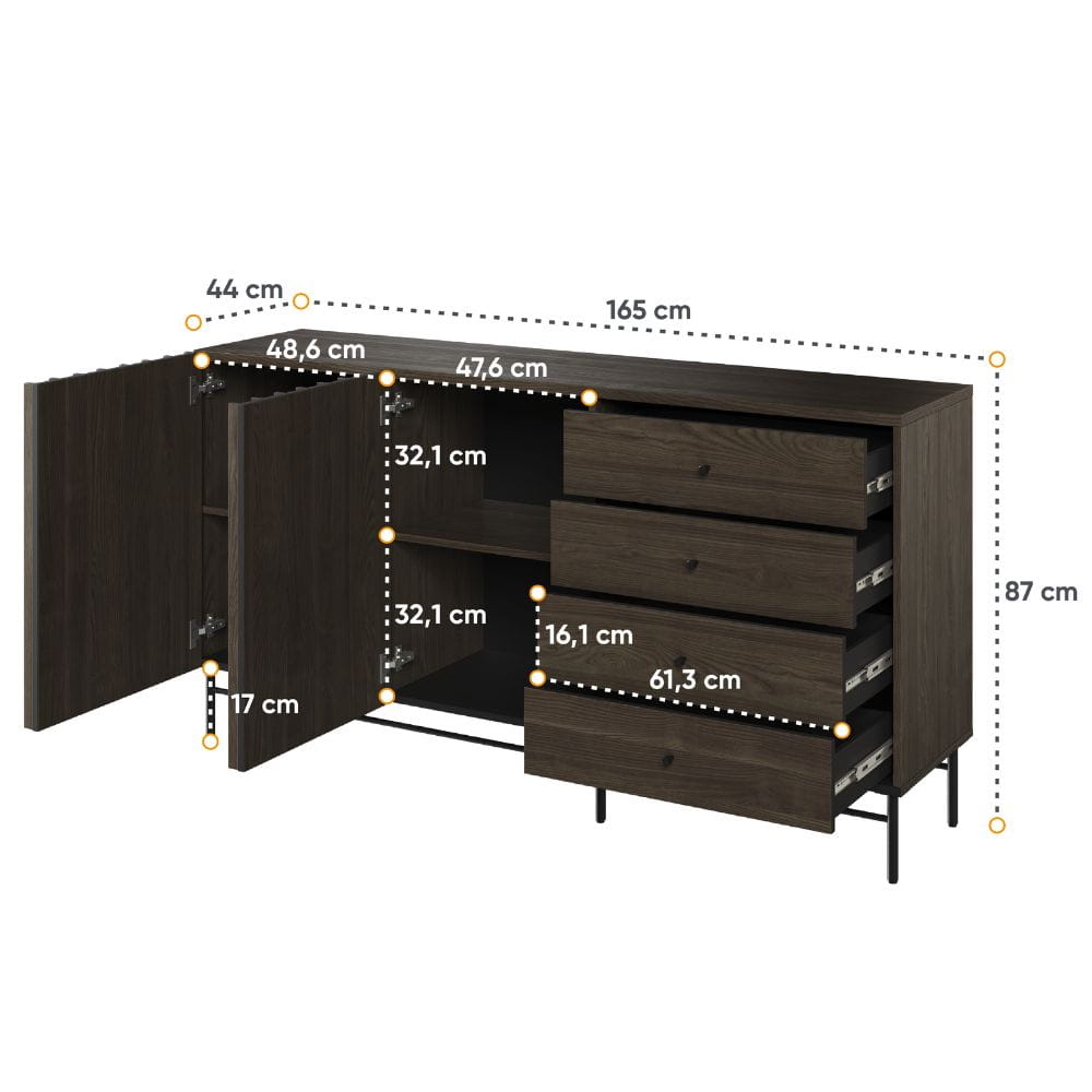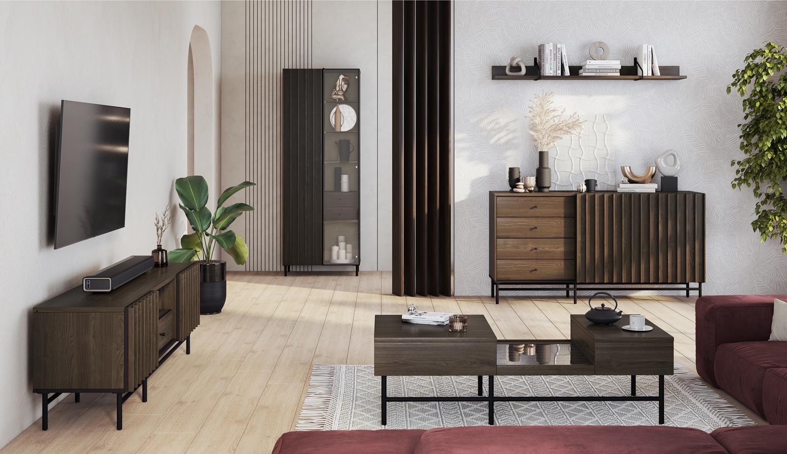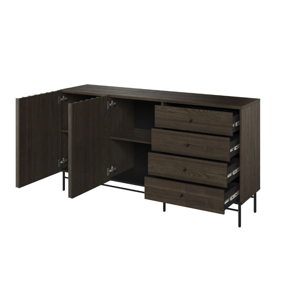 Unikalne ryflowane fronty nadają meblowi wyjątkowego charakteru, a ciemna, elegancka kolorystyka świetnie komponuje się z nowoczesnymi i industrialnymi aranżacjami. Solidne metalowe nóżki dodają lekkości konstrukcji, a jednocześnie zapewniają stabilność i wytrzymałość.