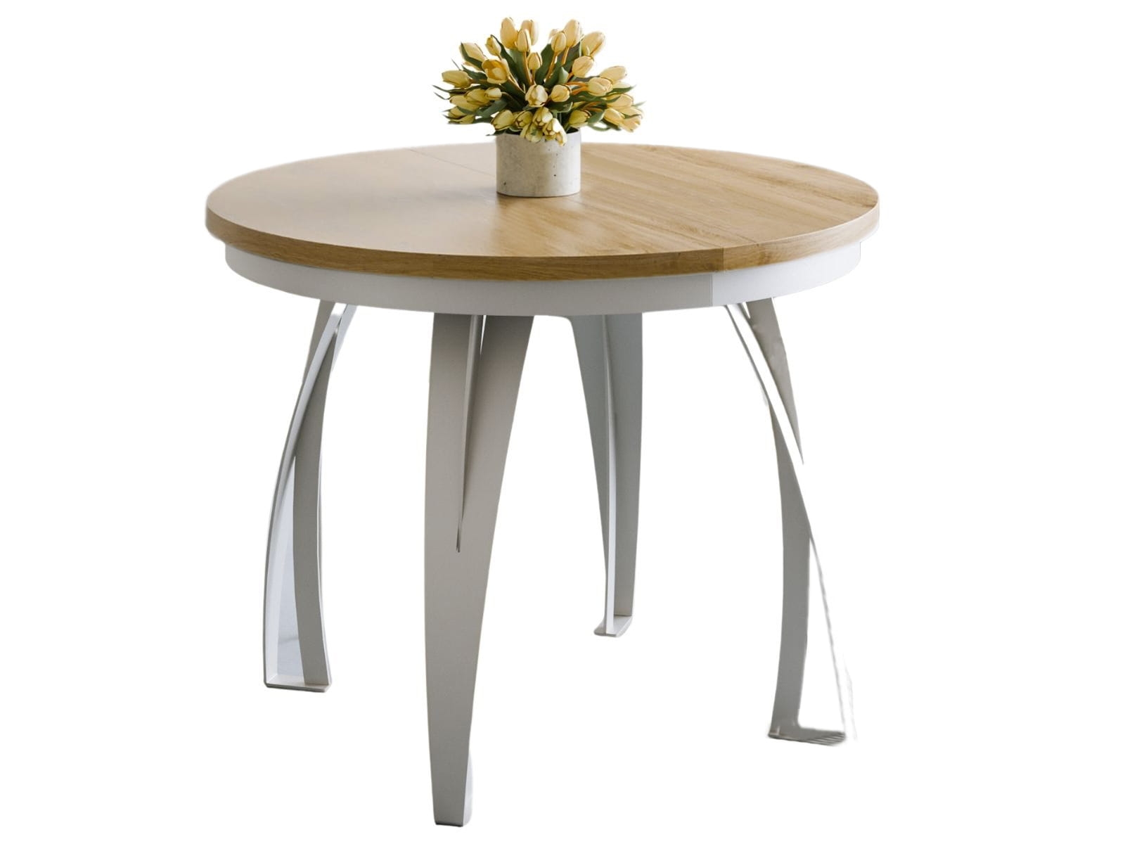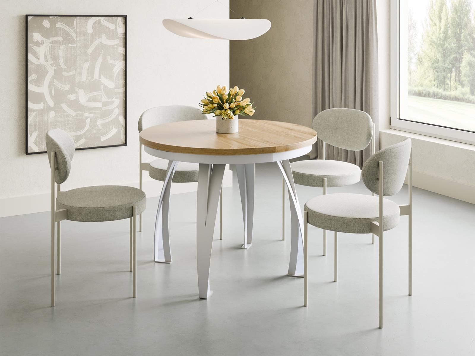 Model dostępny jest w średnicy 100 cm lub 120 cm. Każdy wariant wyposażony jest w dwie wkładki o długości 38 cm, które umożliwiają znaczne powiększenie blatu. Przy średnicy 100 cm wkładki należy przechowywać poza blatem. Czarna, metalowa podstawa z czterema solidnymi nogami zapewnia stabilność konstrukcji oraz swobodę ustawienia krzeseł.