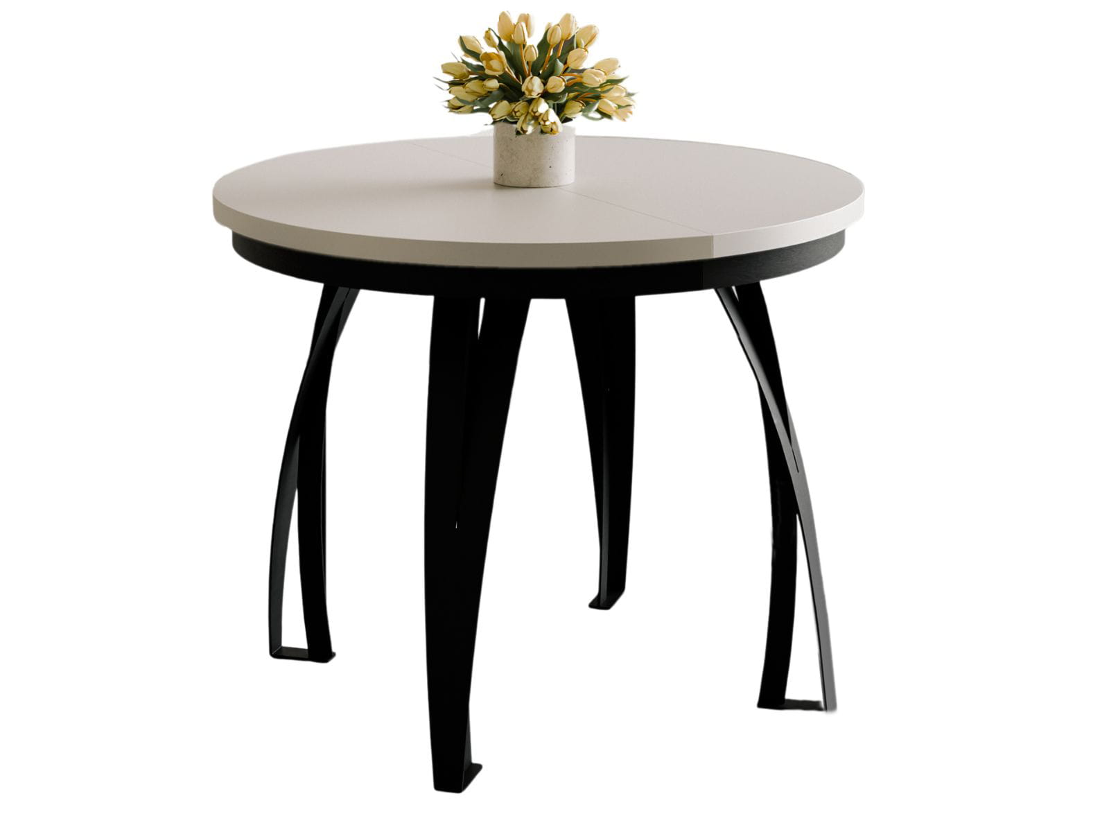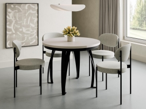 Model dostępny jest w średnicy 100 cm lub 120 cm. Każdy wariant posiada możliwość rozkładania oraz dwie wkładki o długości 38 cm, które umożliwiają znaczne powiększenie powierzchni blatu. Przy średnicy 100 cm wkładki należy przechowywać poza blatem. Cztery solidne metalowe nogi w kolorze czarnym zapewniają stabilność konstrukcji oraz swobodę ustawienia krzeseł.
