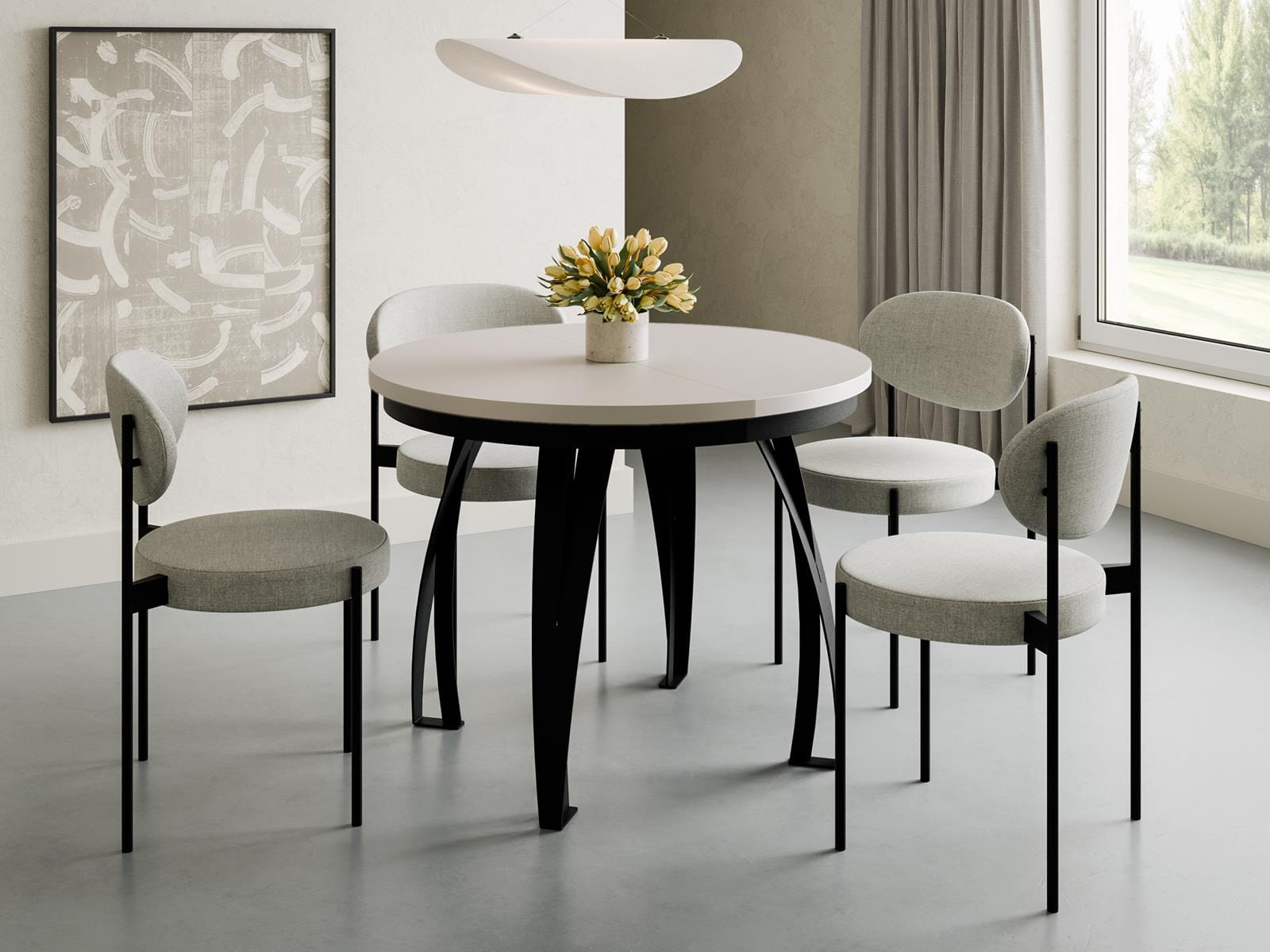 Marzysz o stole, który łączy elegancki kolor kaszmir z wyrazistym, nowoczesnym akcentem? Stół okrągły rozkładany z blatem w kolorze kaszmir na czarnej metalowej podstawie z czterema nogami to doskonały wybór do nowoczesnej kuchni, jadalni lub salonu. Kontrastowe zestawienie kolorów nadaje meblowi charakteru i sprawia, że staje się on centralnym punktem wnętrza.