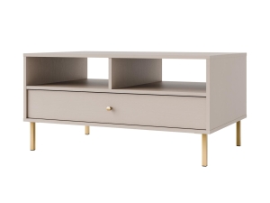 Beżowy stolik kawowy z otwartą półką i szufladą łączy funkcjonalność z eleganckim designem, tworząc idealny element aranżacji salonu. Jego subtelny, ciepły kolor wprowadza do wnętrza przytulność i harmonię, a minimalistyczny styl sprawia, że stolik doskonale komponuje się zarówno z nowoczesnymi, jak i klasycznymi aranżacjami.