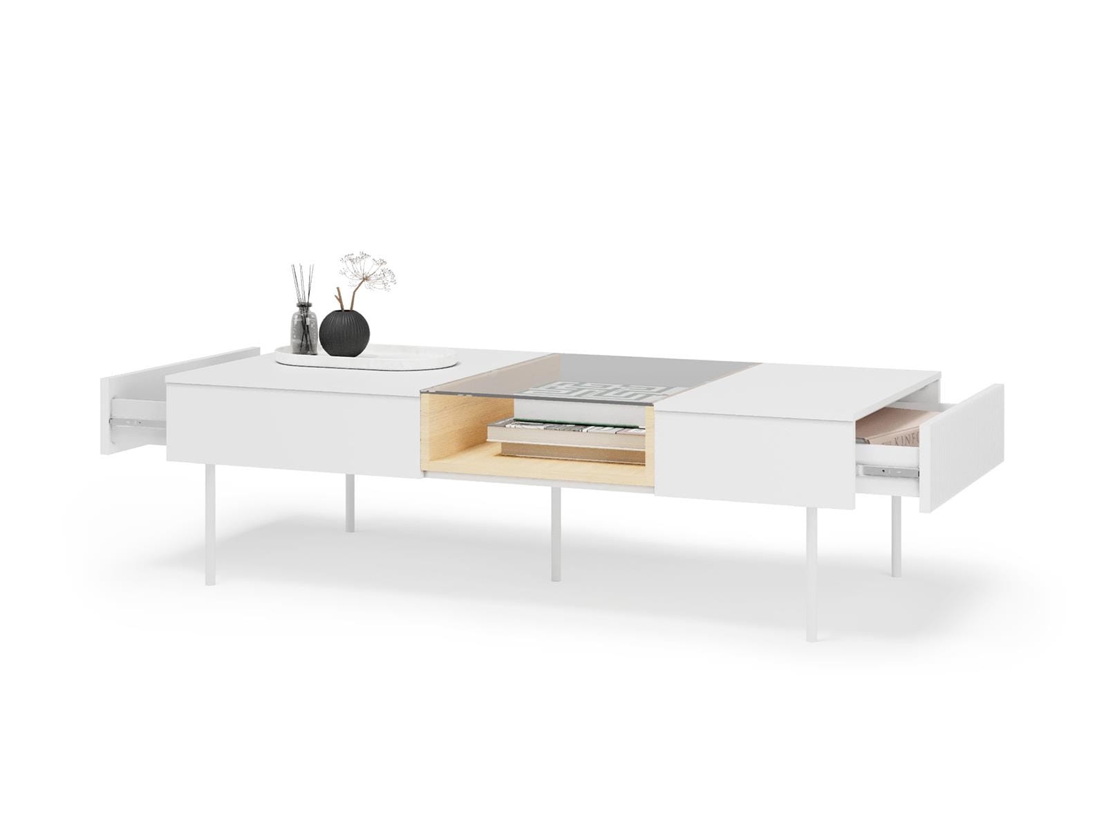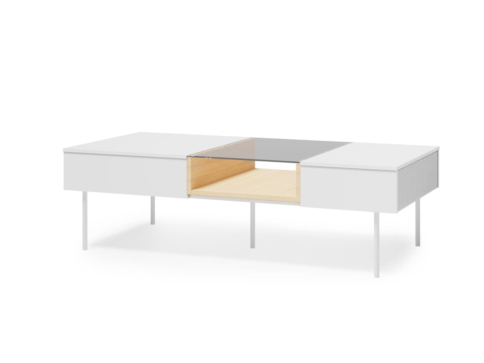Centralna część stolika została wyposażona w przeszklony blat, który nadaje konstrukcji lekkości i nowoczesnego wyglądu. Pod szkłem znajduje się funkcjonalna półka na drobiazgi - idealna na piloty, książki, dekoracje czy codzienne akcesoria. Dzięki temu wszystko masz pod ręką, zachowując jednocześnie porządek.