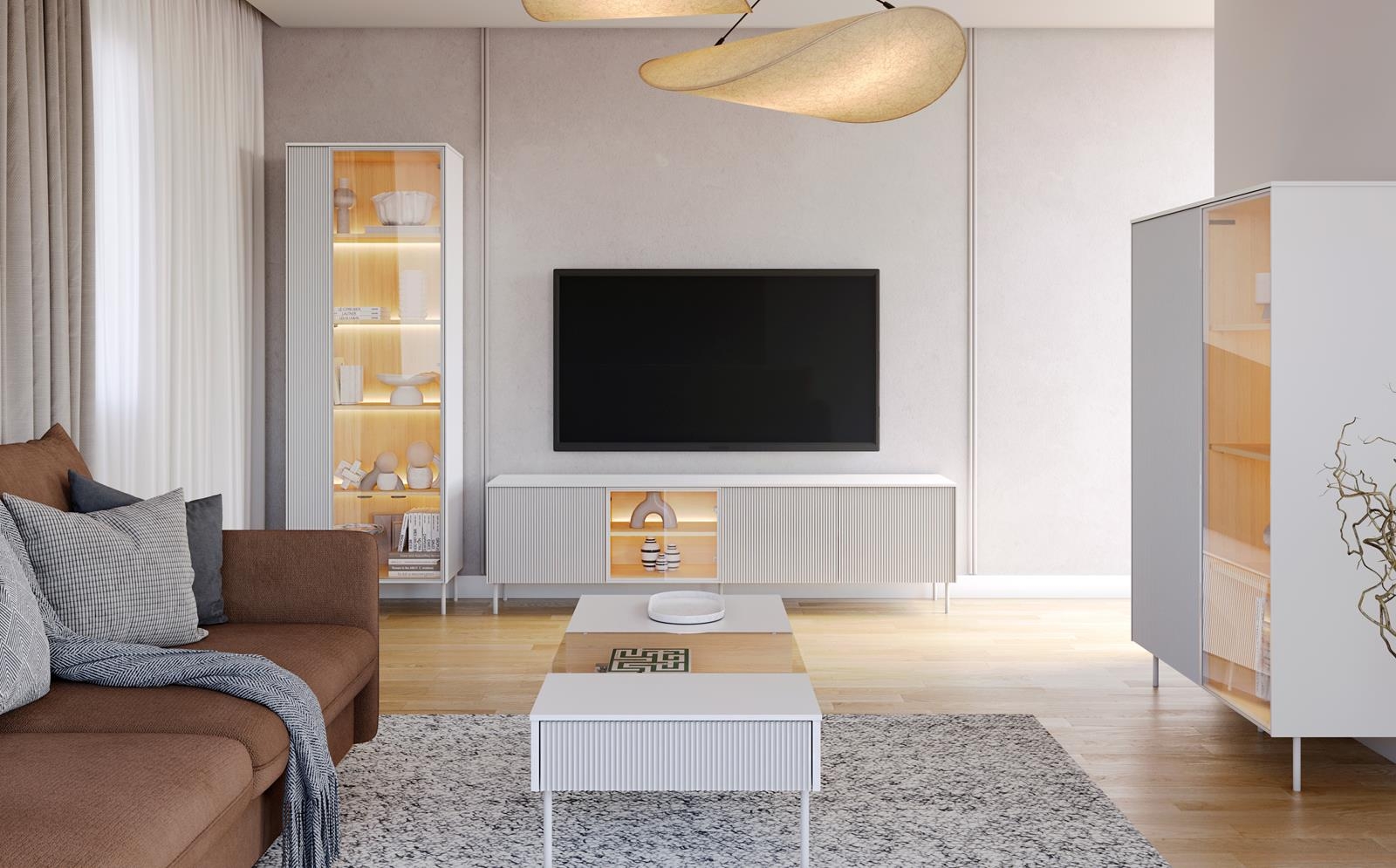 Fronty stolika zostały wykończone subtelnym, delikatnym ryflowaniem, które nadaje meblowi wyjątkowego charakteru i podkreśla jego nowoczesny design. To modny akcent, który przyciąga wzrok i dodaje wnętrzu klasy.