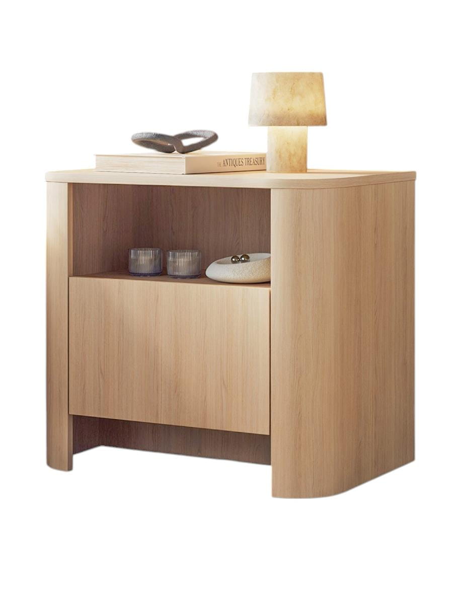 Dębowy stolik nocny Japandi – nowoczesny stolik do sypialni z półką i szufladą