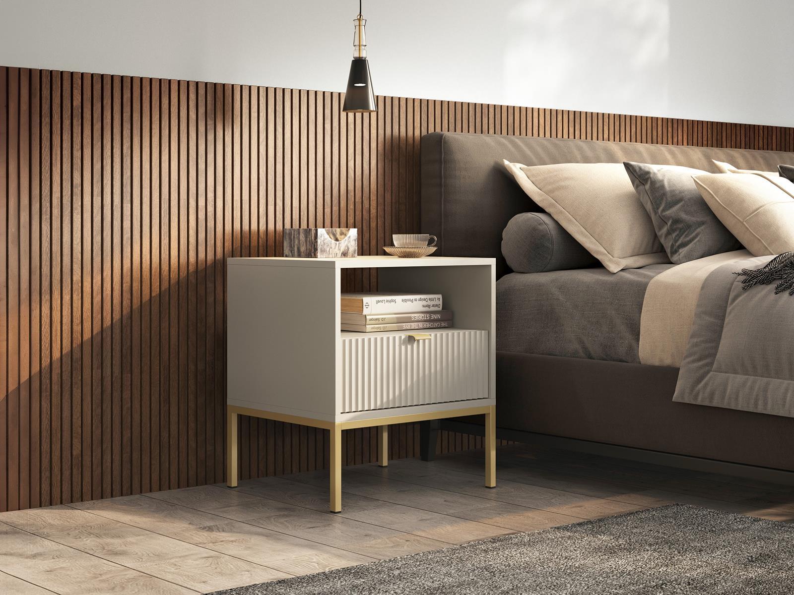 Stolik nocny NANCY to doskonały wybór do każdej sypialni. Ryflowane fronty, będące topowym trendem tego sezonu, nadają meblowi niepowtarzalny wygląd, a złote minimalistyczne uchwyty podkreślają elegancję i luksusowy charakter.
