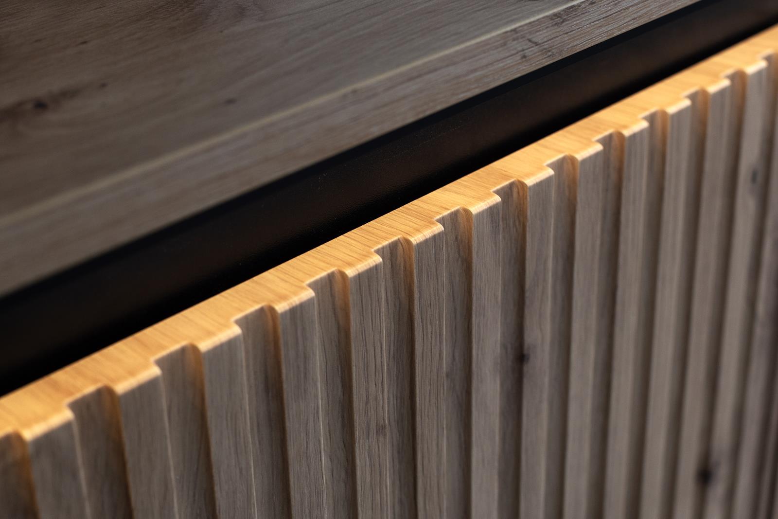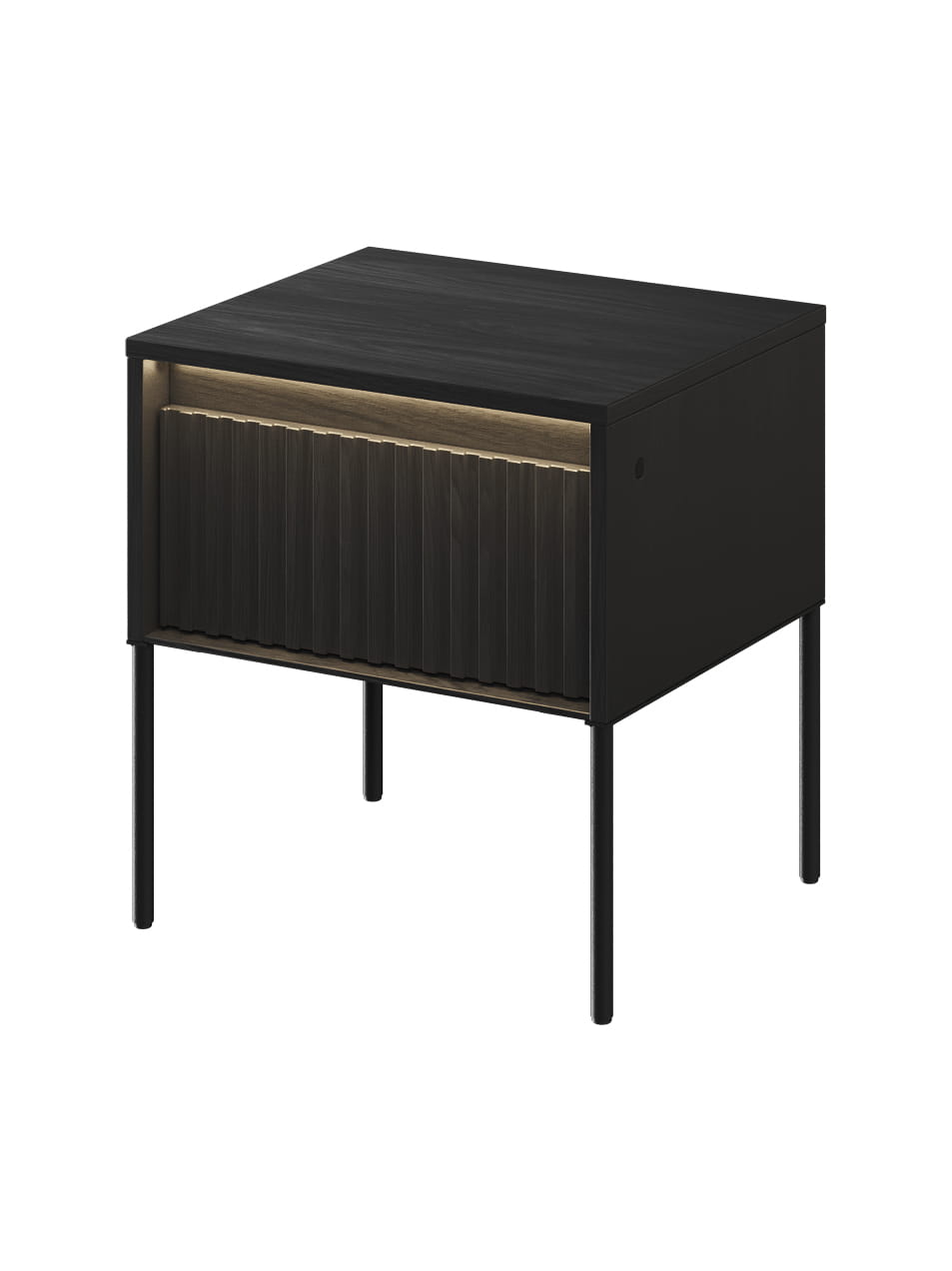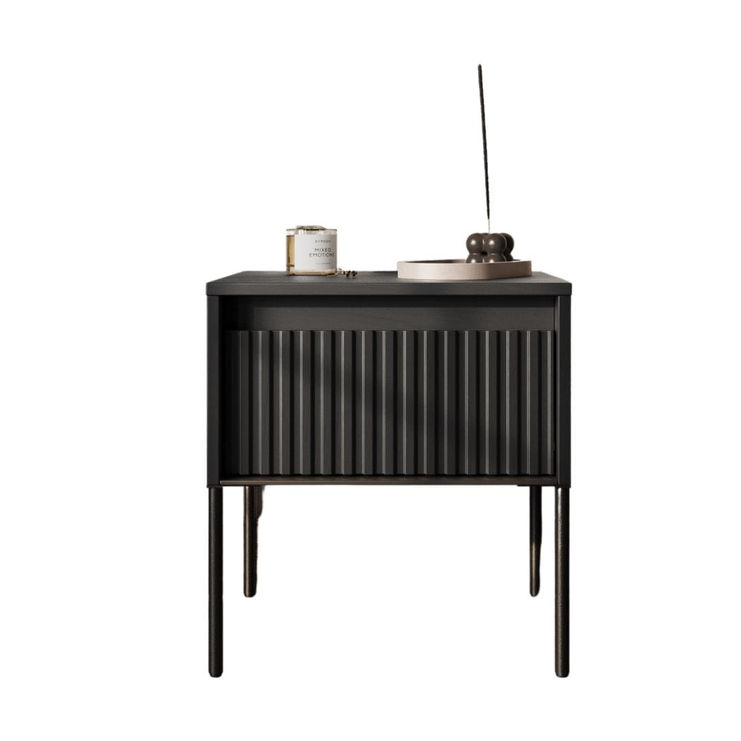 Nowoczesna szafka nocna w kolorze czarnego drewna to połączenie funkcjonalności i eleganckiego designu, które doskonale podkreśli charakter sypialni w stylu modern, glamour czy industrialnym. Jej ryflowane fronty w prostej formie nadają wnętrzu wyjątkowej dekoracyjności, a czarna metalowa rama podkreśla nowoczesny charakter mebla. Dodatkowym atutem jest wbudowane oświetlenie LED, które tworzy nastrojową atmosferę i dodaje wnętrzu luksusowego akcentu.